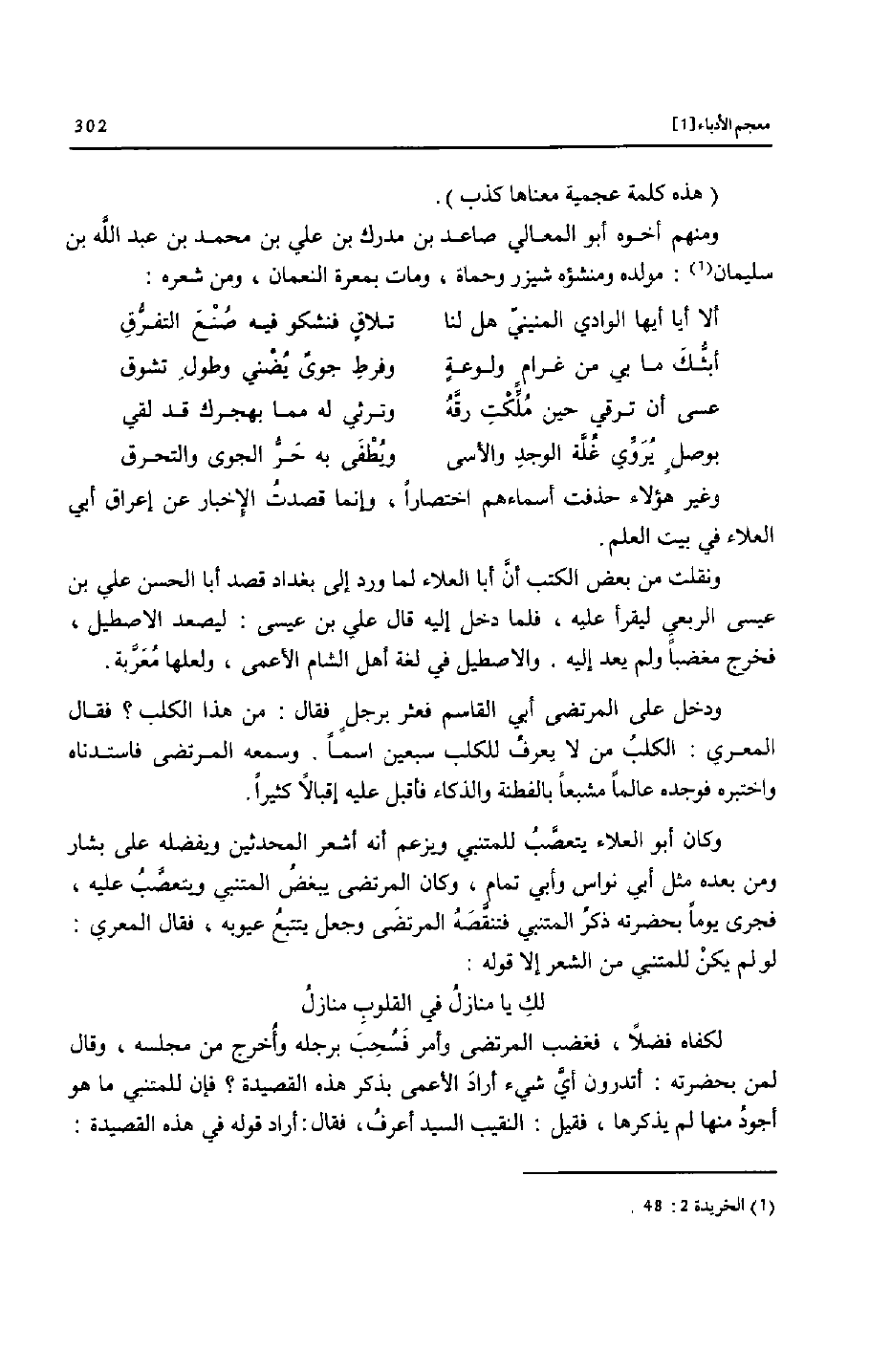 لكفاه فضلا، فغضب المرتضى وأمر فسحب برجله وأخرج من مجلسه، وقال لمن بحضرته: أتدرون أيّ شيء أراد الأعمى بذكر هذه القصيدة؟ فإن للمتنبي ما هو أجود منها لم يذكرها، فقيل: النقيب السيد أعرف، فقال: أراد قوله في هذه القصيدة:
