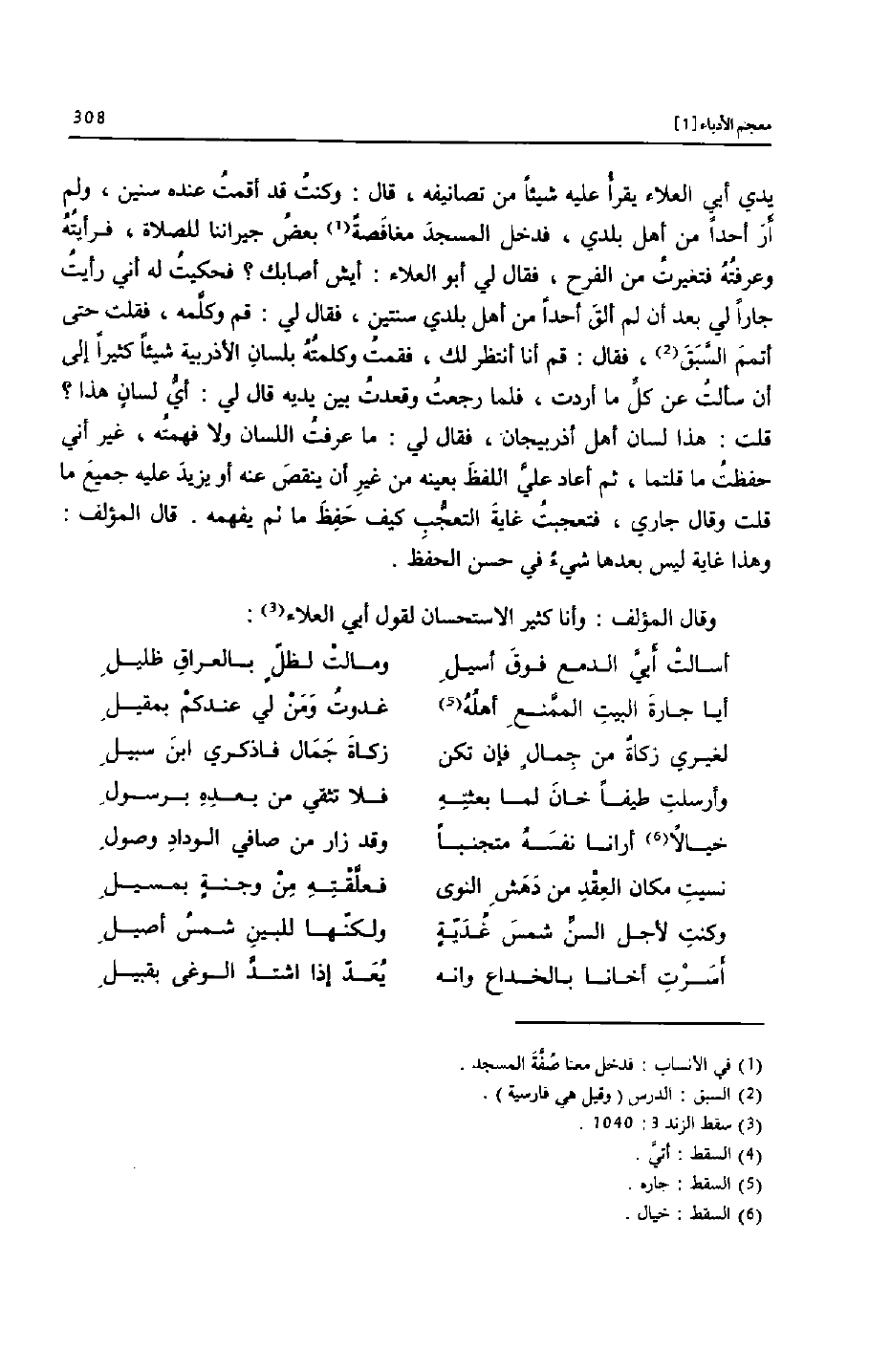 يدي أبي العلاء يقرأ عليه شيئا من تصانيفه، قال: وكنت قد أقمت عنده سنين، ولم أر أحدا من أهل بلدي، فدخل المسجد مغافصة [1] بعض جيراننا للصلاة، فرأيته وعرفته فتغيرت من الفرج، فقال لي أبو العلاء: أيش أصابك؟ فحكيت له أني رأيت جارا لي بعد أن لم ألق أحدا من أهل بلدي سنتين، فقال لي: قم وكلّمه، فقلت حتى أتمم السّبق [2] ، فقال: قم أنا أنتظر لك، فقمت وكلمته بلسان الأذربية شيئا كثيرا إلى أن سألت عن كلّ ما أردت، فلما رجعت وقعدت بين يديه قال لي: أيّ لسان هذا؟