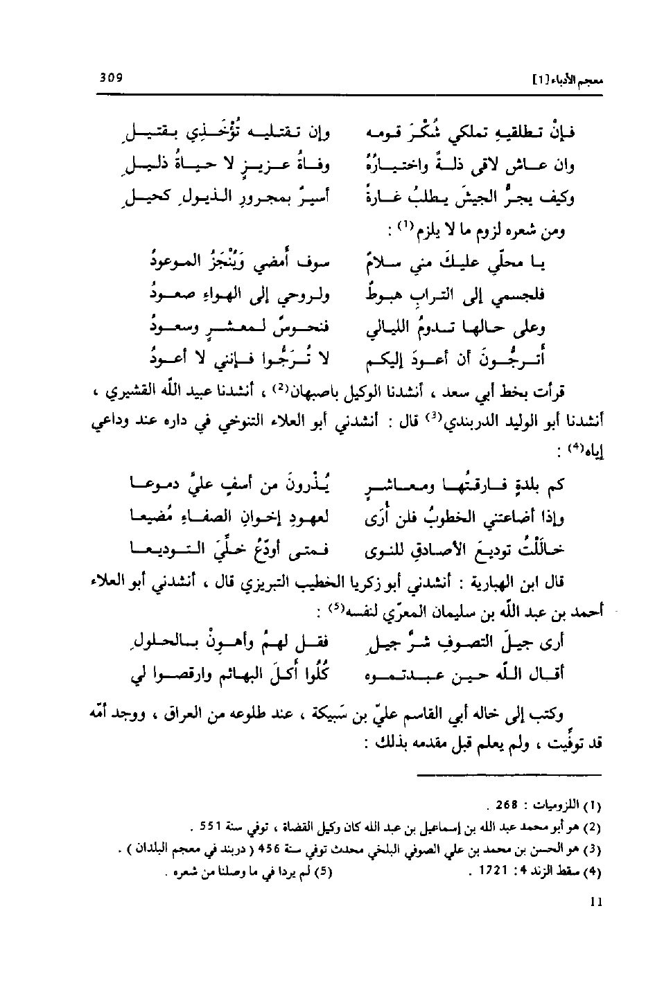 قرأت بخط أبي سعد، أنشدنا الوكيل باصبهان [2] ، أنشدنا عبيد الله القشيري، أنشدنا أبو الوليد الدربندي [3] قال: أنشدني أبو العلاء التنوخي في داره عند وداعي إياه [4] :