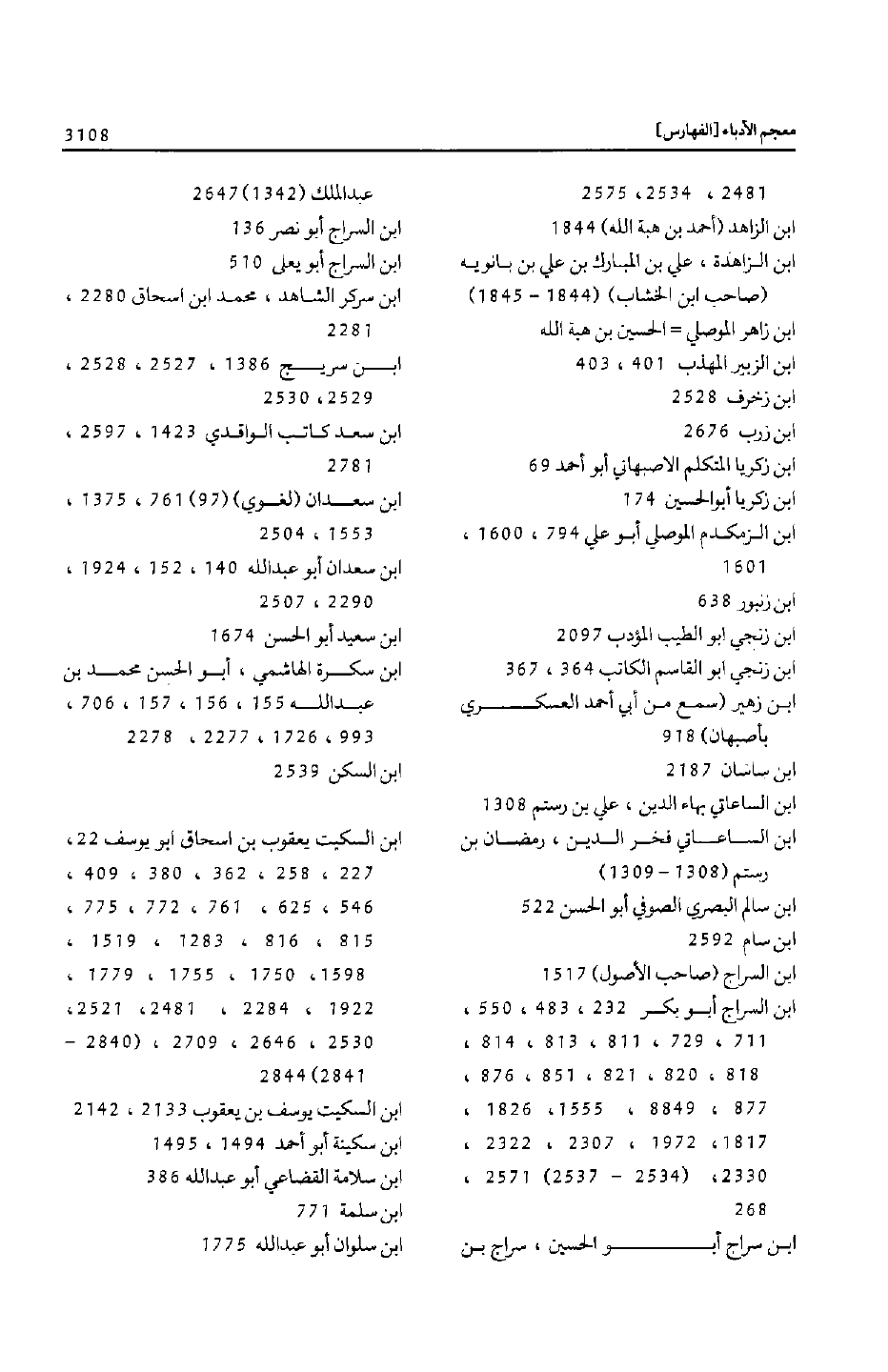 ابن السكيت يعقوب بن اسحاق ابو يوسف 22، 227، 258، 362، 380، 409، 546، 625، 761، 772، 775، 815، 816، 1283، 1519، 1598، 1750، 1755، 1779، 1922، 2284، 2481، 2521، 2530، 2646، 2709، (2840- 2841) 2844