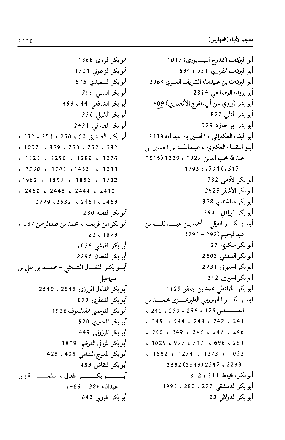 أبو بكر الصديق 50، 250، 251، 632، 682، 752، 753، 859، 1002، 1276، 1289، 1290، 1323، 1338، 1453، 1701، 1730، 1732، 1856، 1857، 1962، 2412، 2444، 2445، 2459، 2463، 2464، 2632، 2779