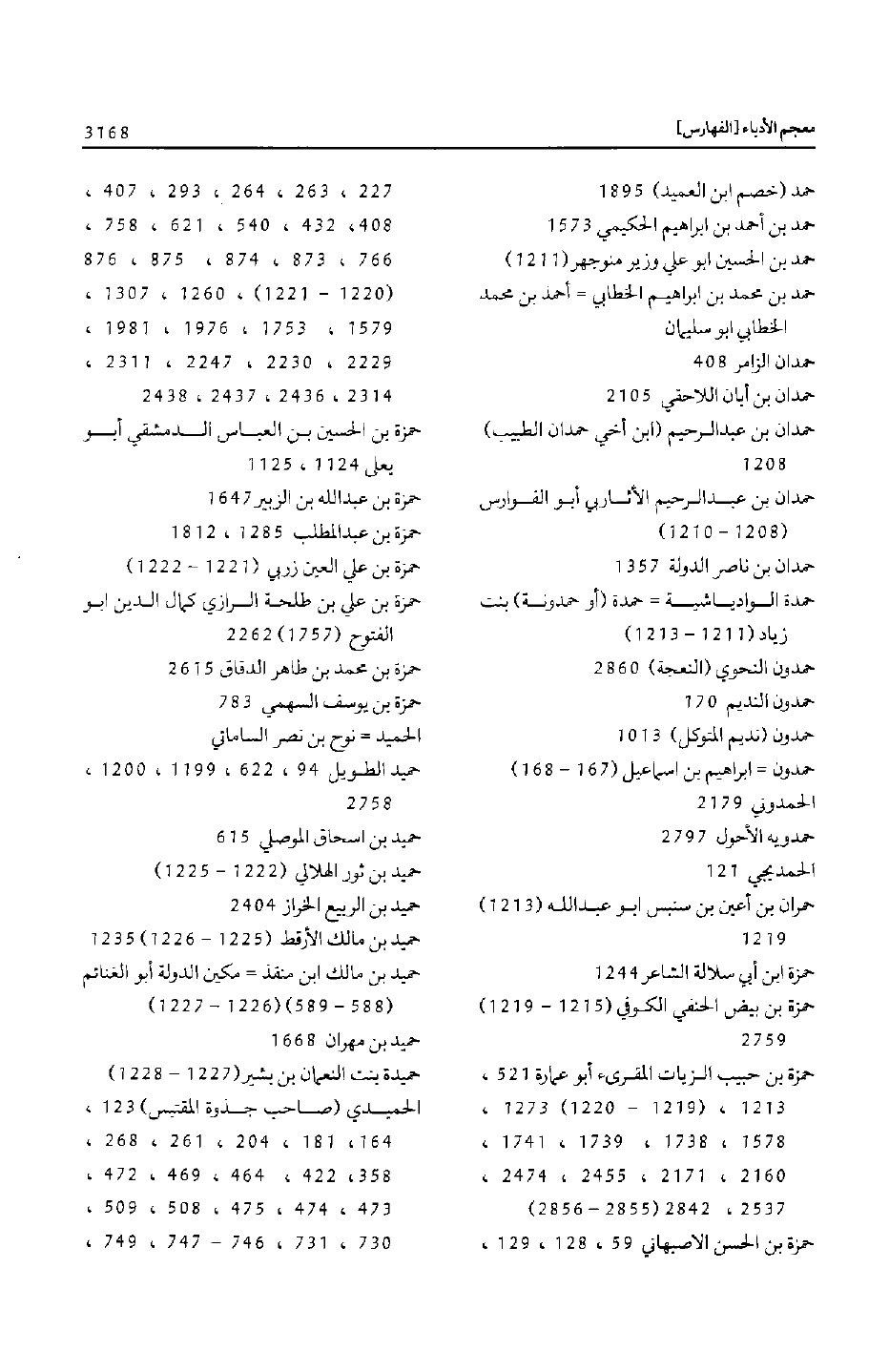حمزة بن حبيب الزيات المقرىء أبو عمارة 521، 1213، (1219- 1220) 1273، 1578، 1738، 1739، 1741، 2160، 2171، 2455، 2474، 2537، 2842 (2855- 2856)