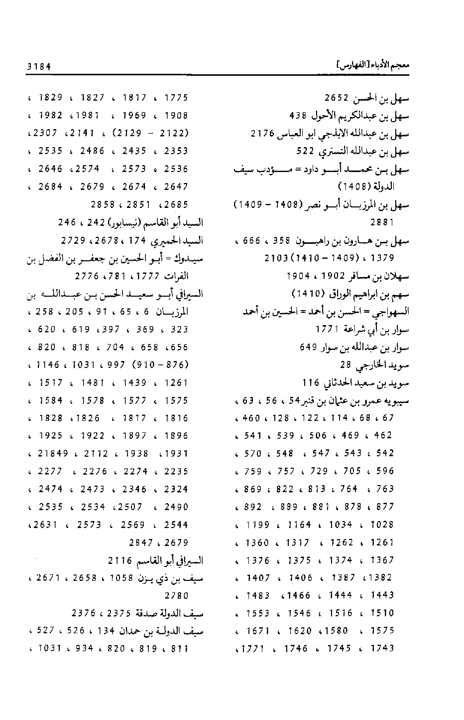 السيرافي أبو سعيد الحسن بن عبد الله بن المرزبان 6، 65، 91، 205، 258، 323، 369، 397، 619، 620، 656، 658، 704، 818، 820، (876- 910) 997، 1031، 1146، 1261، 1439، 1481، 1517، 1575، 1577، 1578، 1584، 1816، 1817، 1826، 1828، 1896، 1897، 1922، 1925، 1931، 1938، 2112، 21849، 2235، 2274، 2276، 2277، 2324، 2346، 2473، 2474، 2490، 2507، 2534، 2535، 2544، 2569، 2573، 2631، 2679، 2847