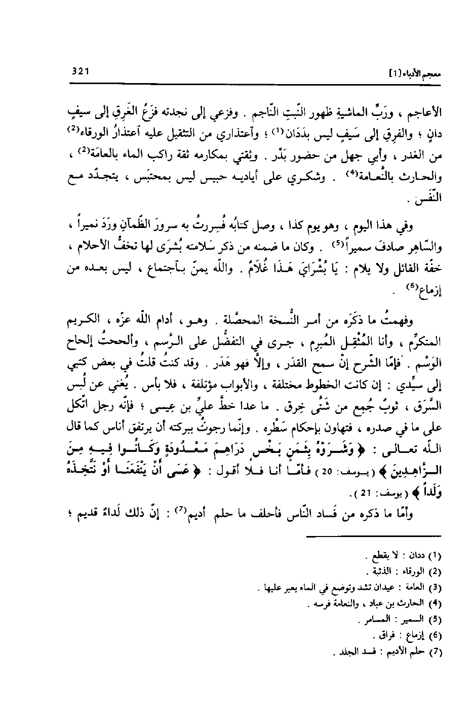 الأعاجم، وربّ الماشية ظهور النّبت النّاجم. وفزعي إلى نجدته فزع الغرق إلى سيف دان؛ والفرق إلى سيف ليس بددان [1] ؛ واعتذاري من التثقيل عليه اعتذار الورقاء [2] من الغدر، وأبي جهل من حضور بدر. وثقتي بمكارمه ثقة راكب الماء بالعامة [2] ، والحارث بالنّعامة [4] . وشكري على أياديه حبيس ليس بمحتبس، يتجدّد مع النّفس.