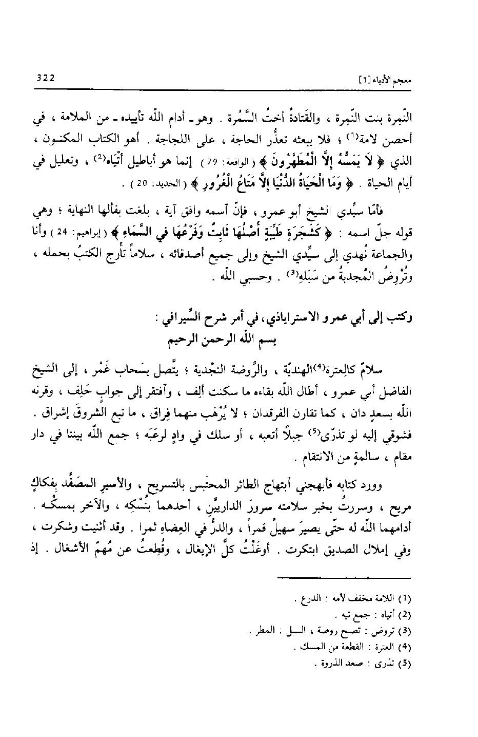 سلام كالعترة [4] الهنديّة، والرّوضة النجدية؛ يتّصل بسحاب غمر، إلى الشيخ الفاضل أبي عمرو، أطال الله بقاءه ما سكنت ألف، وافتقر إلى جواب حلف، وقرنه الله بسعد دان، كما تقارن الفرقدان؛ لا يرهب منهما فراق، ما تبع الشروق إشراق.