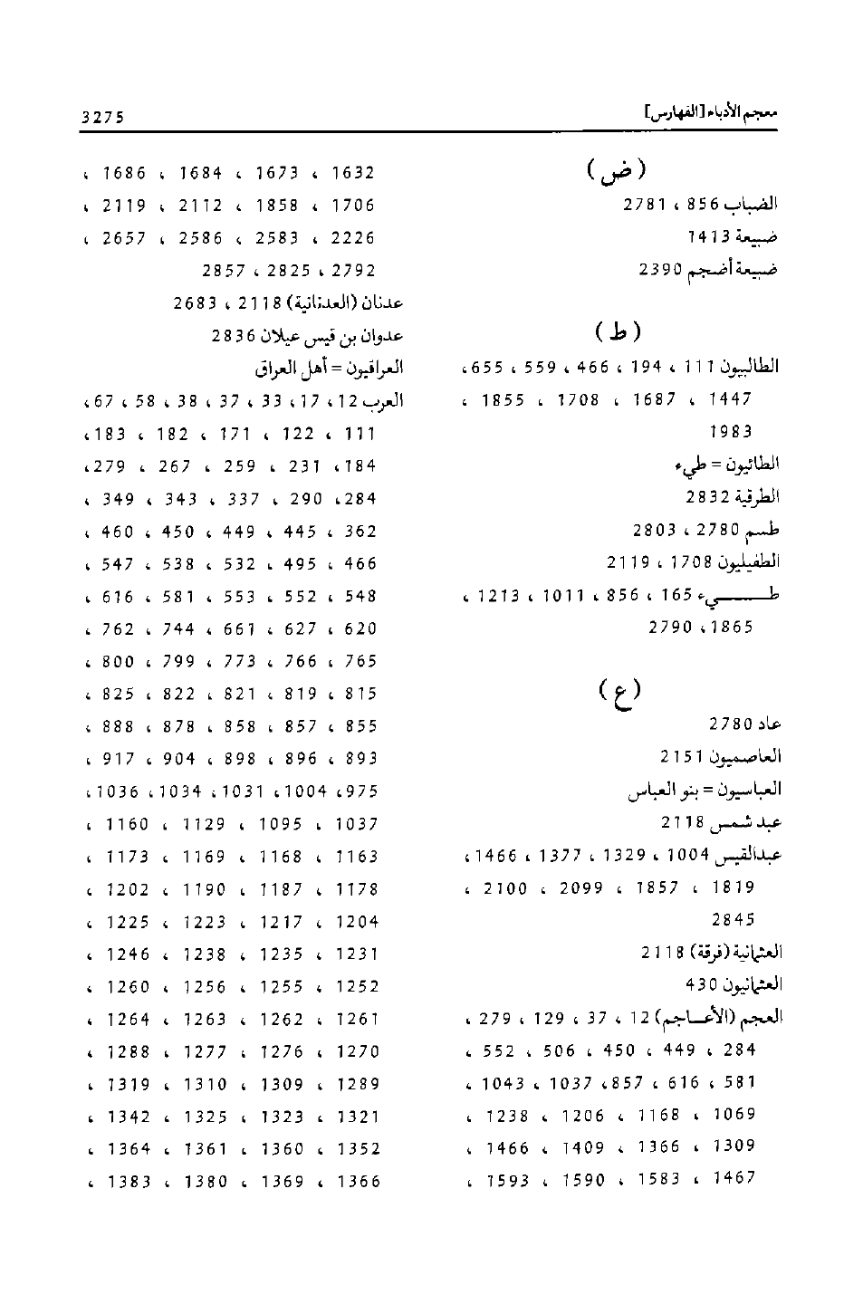 العجم (الأعاجم) 12، 37، 129، 279، 284، 449، 450، 506، 552، 581، 616، 857، 1037، 1043، 1069، 1168، 1206، 1238، 1309، 1366، 1409، 1466، 1467، 1583، 1590، 1593،