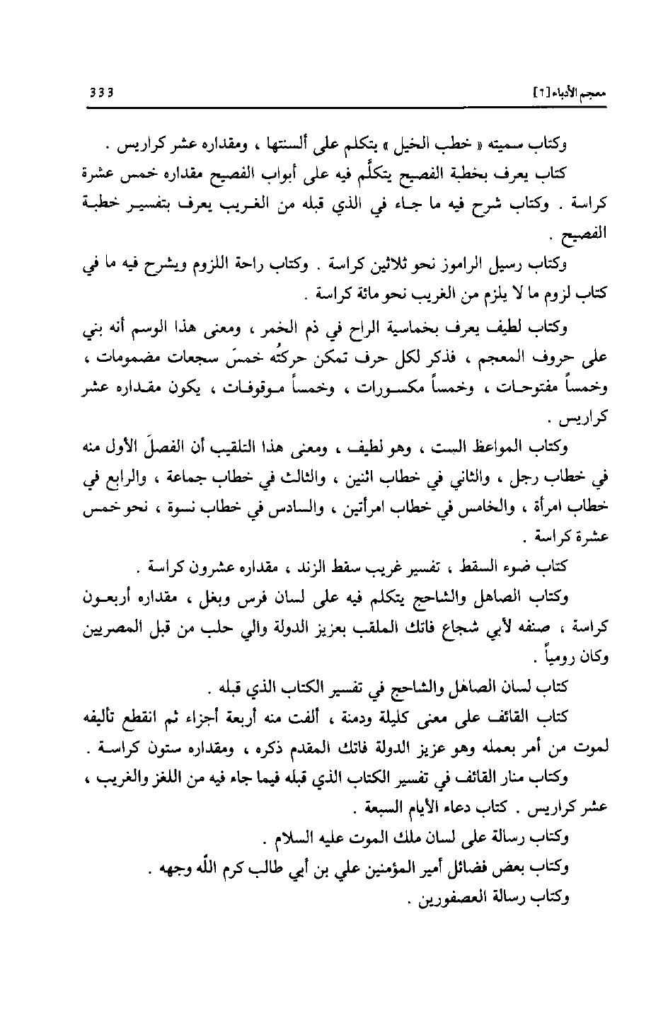 وكتاب سميته «خطب الخيل» يتكلم على ألسنتها، ومقداره عشر كراريس.