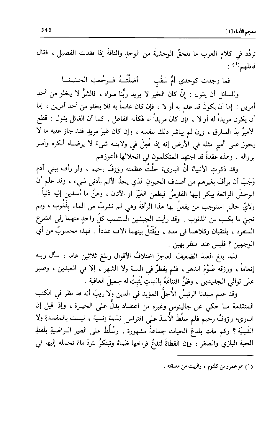 وقد ذكرت الأنبياء أنّ البارىء جلّت عظمته رؤوف رحيم، ولو رأف ببني آدم وجب أن يرأف بغيرهم من أصناف الحيوان الذي يجد الألم بأدنى شيء، وقد علم أن الوحش الراتعة يبكر إليها الفارس فيطعن العير أو الأتان، وهنّ ما أسدين إليه ذنبا.