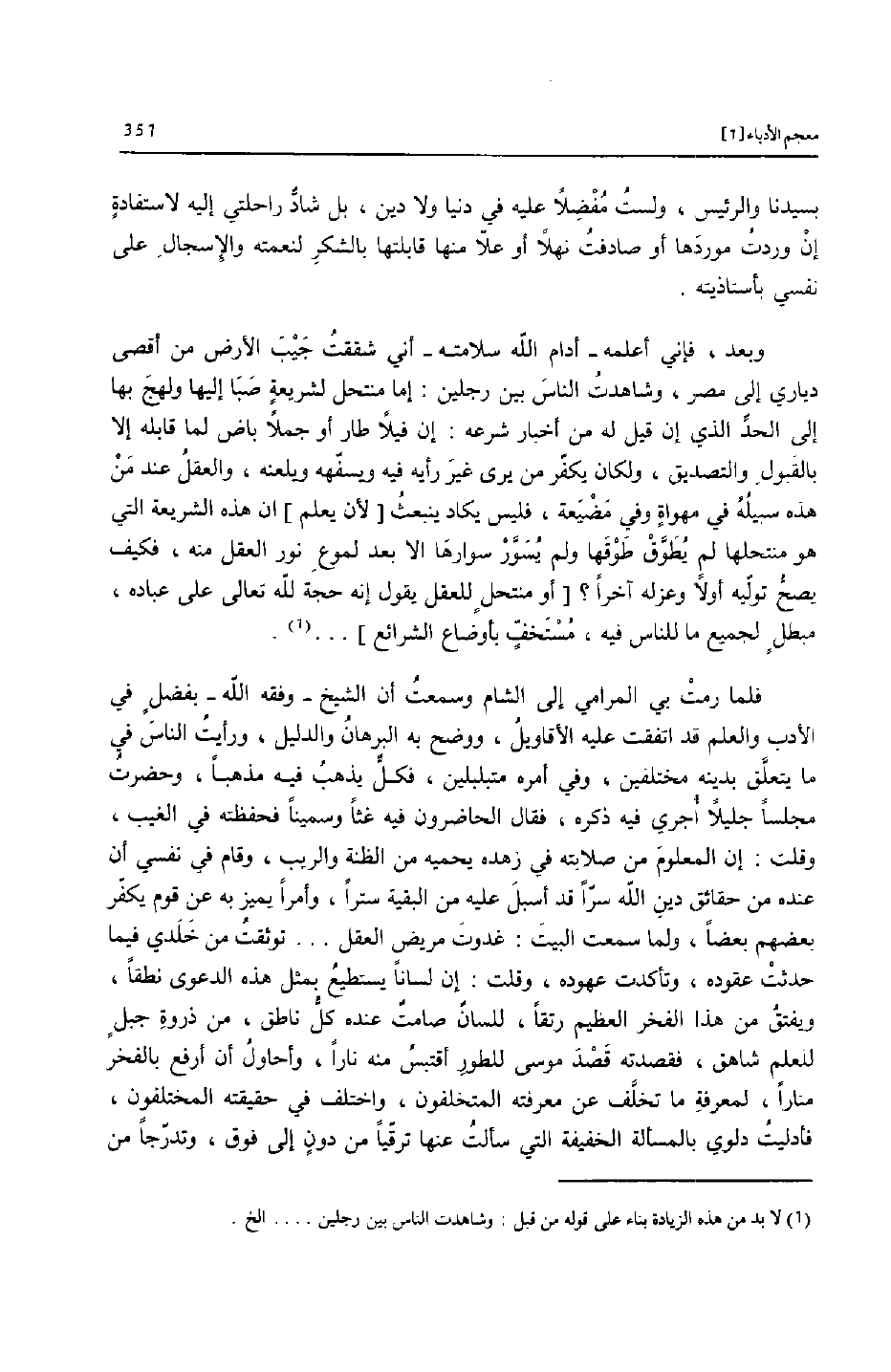 وبعد، فإني أعلمه- أدام الله سلامته- أني شققت جيب الأرض من أقصى دياري إلى مصر، وشاهدت الناس بين رجلين: إما منتحل لشريعة صبا إليها ولهج بها إلى الحدّ الذي إن قيل له من أخبار شرعه: إن فيلا طار أو جملا باض لما قابله إلا بالقبول والتصديق، ولكان يكفّر من يرى غير رأيه فيه ويسفّهه ويلعنه، والعقل عند من هذه سبيله في مهواة وفي مضيعة، فليس يكاد ينبعث [لأن يعلم] ان هذه الشريعة التي هو منتحلها لم يطوّق طوقها ولم يسوّر سوارها الا بعد لموع نور العقل منه، فكيف يصحّ تولّيه أولا وعزله آخرا؟ [أو منتحل للعقل يقول إنه حجة لله تعالى على عباده، مبطل لجميع ما للناس فيه، مستخفّ بأوضاع الشرائع] ... [1] .