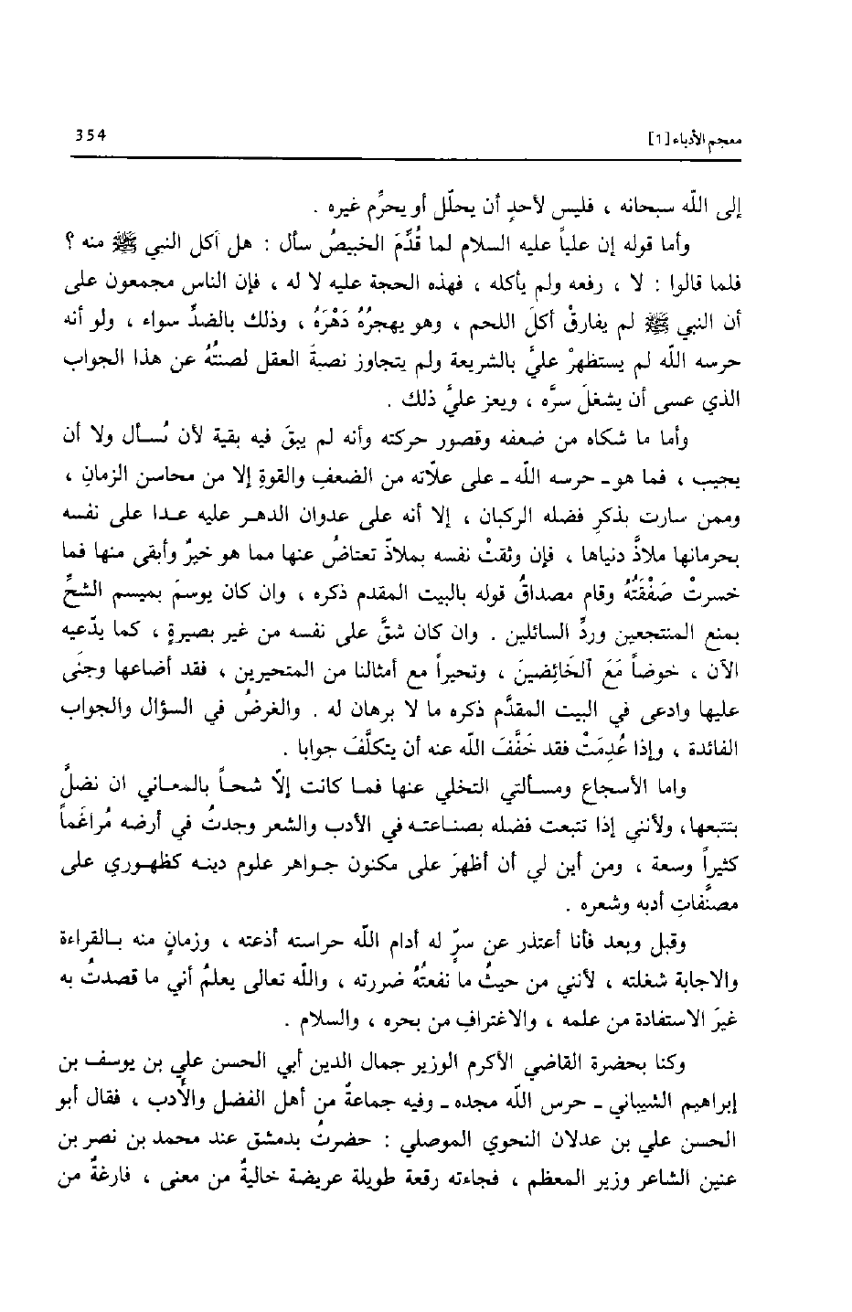 واما الأسجاع ومسألتي التخلي عنها فما كانت إلّا شحا بالمعاني ان نضلّ بتتبعها، ولأنني إذا تتبعت فضله بصناعته في الأدب والشعر وجدت في أرضه مراغما كثيرا وسعة، ومن أين لي أن أظهر على مكنون جواهر علوم دينه كظهوري على مصنفّات أدبه وشعره.