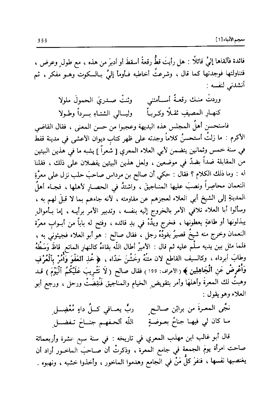 فاستحسن أهل المجلس هذه البديهة وعجبوا من حسن المعنى، فقال القاضي الأكرم: ما زلت أستحسن كلاما وجدته على ظهر كتاب ديوان الأعشى في مدينة قفط في سنة خمس وثمانين يتضمن لأبي العلاء المعري [شعرا] يشبه ما في هذين البيتين من المقابلة ضدا بضدّ في موضعين، ولعل هذين البيتين يفضلان على ذلك، فقلنا له: وما ذلك الكلام؟ فقال: حكي أن صالح بن مرداس صاحب حلب نزل على معرّة النعمان محاصرا ونصب عليها المناجيق، واشتدّ في الحصار لأهلها، فجاء أهل المدينة إلى الشيخ أبي العلاء لعجزهم عن مقاومته، لأنه جاءهم بما لا قبل لهم به، وسألوا أبا العلاء تلافي الأمر بالخروج إليه بنفسه، وتدبير الأمر برأيه، إما بأموال يبذلونها أو طاعة يعطونها، فخرج ويده في يد قائده، وفتح له بابا من أبواب معرّة النعمان وخرج منه شيخ قصير يقوده رجل، فقال صالح: هو أبو العلاء فجيئوني به، فلما مثل بين يديه سلّم عليه ثم قال: الأمير أطال الله بقاءه كالنهار الماتع قاظ وسطه وطاب أبرداه، وكالسيف القاطع لان متنه وخشن حدّاه، خُذِ الْعَفْوَ وَأْمُرْ بِالْعُرْفِ وَأَعْرِضْ عَنِ الْجاهِلِينَ