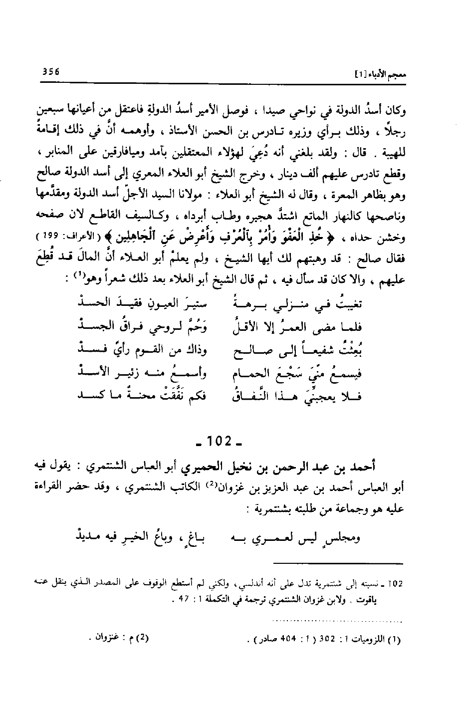 [102]- نسبته إلى شنتمرية تدل على أنه أندلسي، ولكني لم أستطع الوقوف على المصدر الذي ينقل عنه ياقوت. ولابن غزوان الشنتمري ترجمة في التكملة 1: 47.