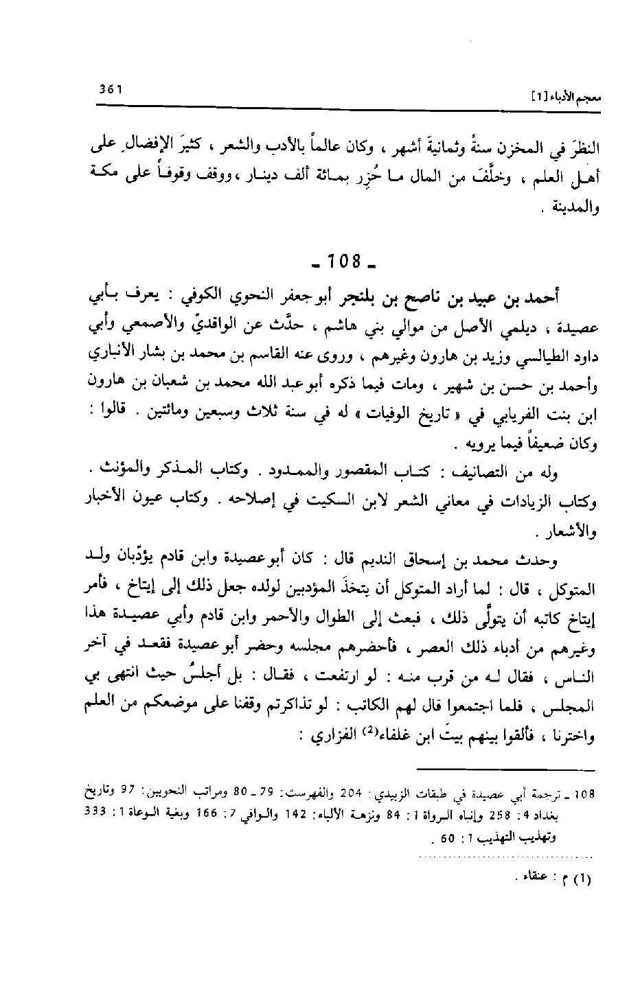 [108]- ترجمة أبي عصيدة في طبقات الزبيدي: 204 والفهرست: 79- 80 ومراتب النحويين: 97 وتاريخ بغداد 4: 258 وإنباه الرواة 1: 84 ونزهة الألباء: 142 والوافي 7: 166 وبغية الوعاة 1: 333 وتهذيب التهذيب 1: 60.