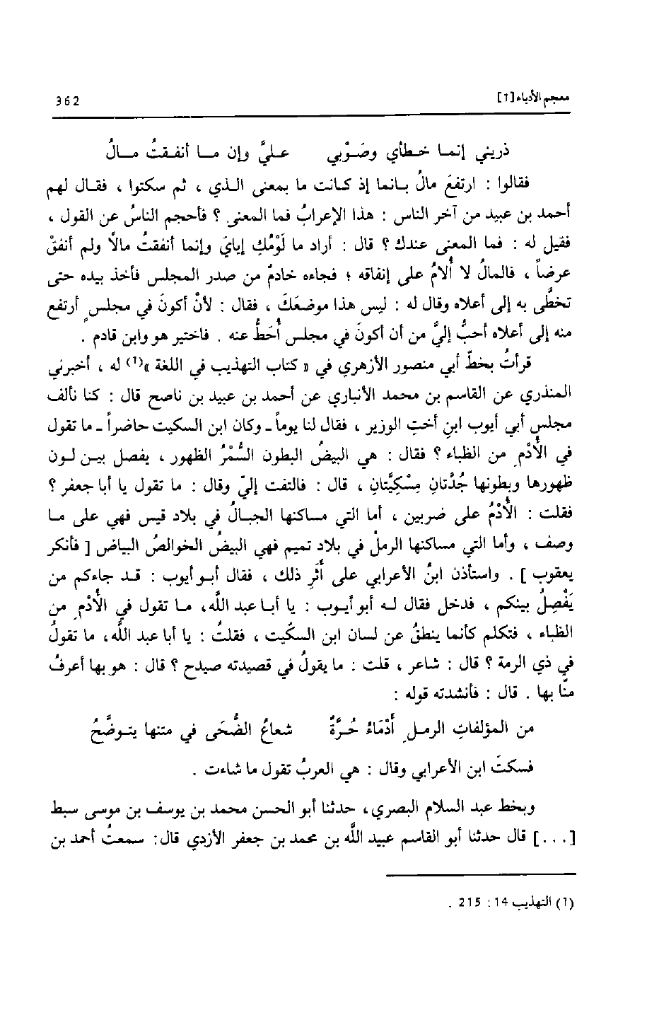 قرأت بخطّ أبي منصور الأزهري في «كتاب التهذيب في اللغة» [1] له، أخبرني المنذري عن القاسم بن محمد الأنباري عن أحمد بن عبيد بن ناصح قال: كنا نألف مجلس أبي أيوب ابن أخت الوزير، فقال لنا يوما- وكان ابن السكيت حاضرا- ما تقول في الأدم من الظباء؟ فقال: هي البيض البطون السّمر الظهور، يفصل بين لون ظهورها وبطونها جدّتان مسكيّتان، قال: فالتفت إليّ وقال: ما تقول يا أبا جعفر؟