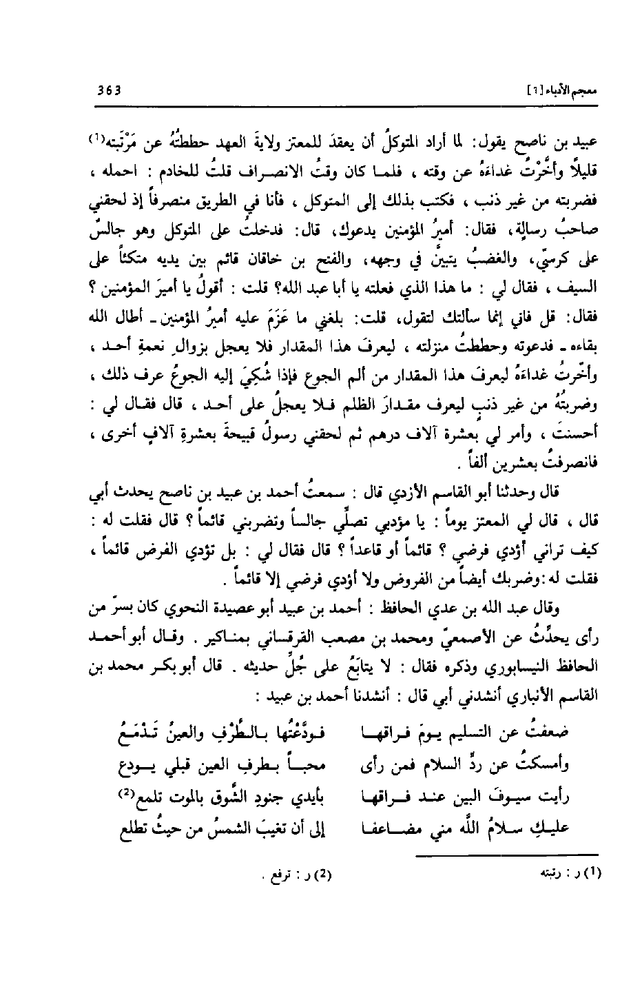 قال وحدثنا أبو القاسم الأزدي قال: سمعت أحمد بن عبيد بن ناصح يحدث أبي قال، قال لي المعتز يوما: يا مؤدبي تصلّي جالسا وتضربني قائما؟ قال فقلت له: