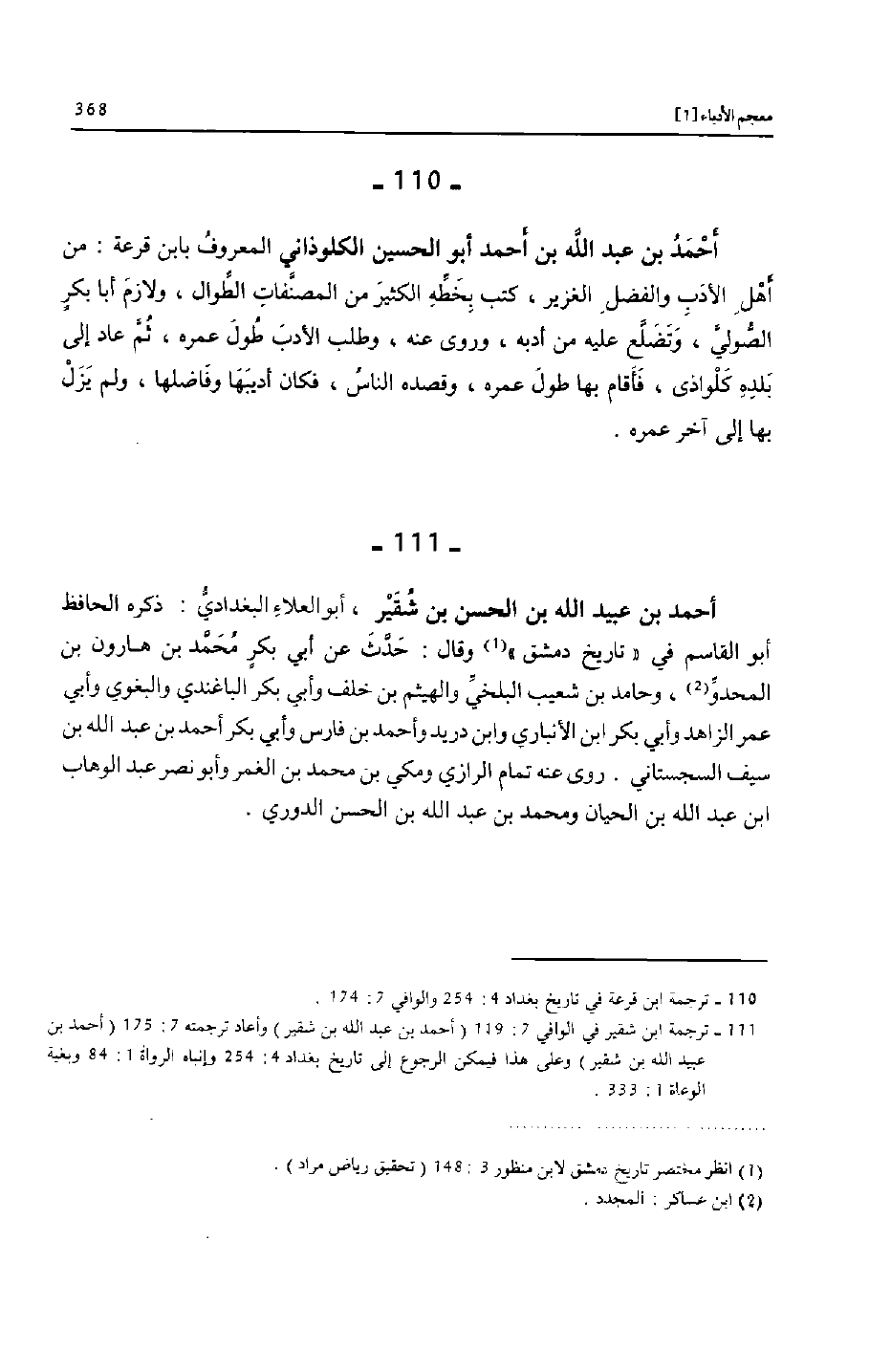 [111]- ترجمة ابن شقير في الوافي 7: 119 (أحمد بن عبد الله بن شقير) وأعاد ترجمته 7: 175 (أحمد بن عبيد الله بن شقير) وعلى هذا فيمكن الرجوع إلى تاريخ بغداد 4: 254 وإنباه الرواة 1: 84 وبغية الوعاة 1: 333.