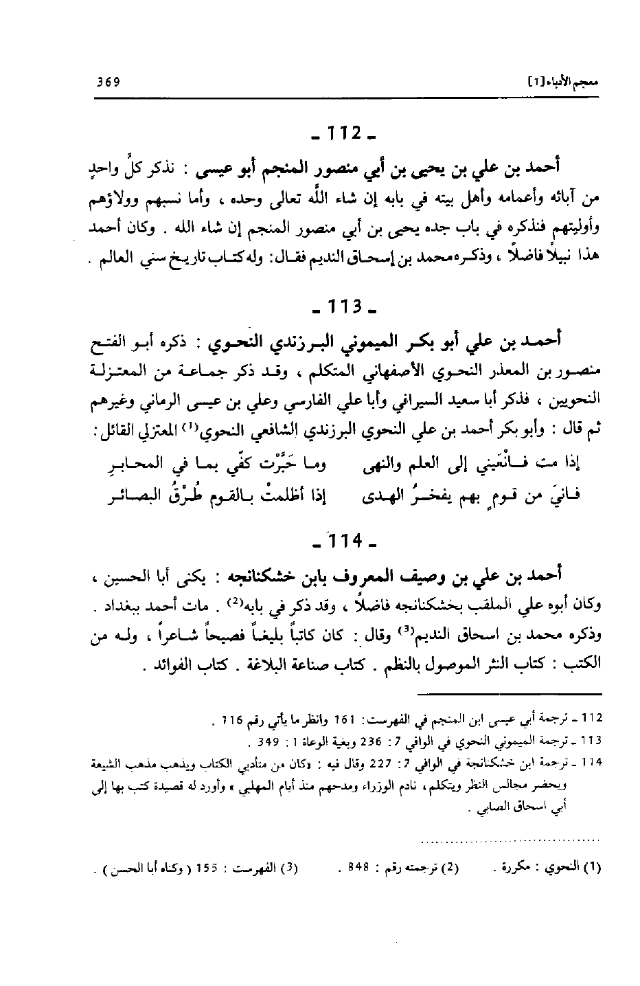 [114]- ترجمة ابن خشكنانجة في الوافي 7: 227 وقال فيه: «كان من متأدبي الكتاب ويذهب مذهب الشيعة ويحضر مجالس النظر ويتكلم، نادم الوزراء ومدحهم منذ أيام المهلبي» وأورد له قصيدة كتب بها إلى أبي اسحاق الصابي.