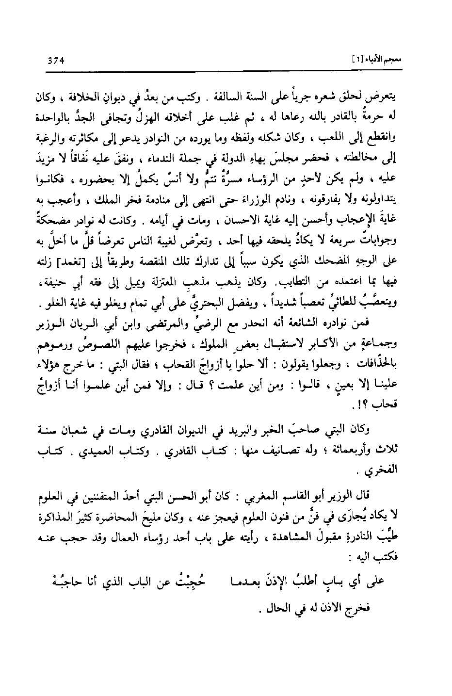 يتعرض لحلق شعره جريا على السنة السالفة. وكتب من بعد في ديوان الخلافة، وكان له حرمة بالقادر بالله رعاها له، ثم غلب على أخلاقه الهزل وتجافى الجدّ بالواحدة وانقطع إلى اللعب، وكان شكله ولفظه وما يورده من النوادر يدعو إلى مكاثرته والرغبة إلى مخالطته، فحضر مجلس بهاء الدولة في جملة الندماء، ونفق عليه نفاقا لا مزيد عليه، ولم يكن لأحد من الرؤساء مسرّة تتمّ ولا أنس يكمل إلا بحضوره، فكانوا يتداولونه ولا يفارقونه، ونادم الوزراء حتى انتهى إلى منادمة فخر الملك، وأعجب به غاية الإعجاب وأحسن إليه غاية الاحسان، ومات في أيامه. وكانت له نوادر مضحكة وجوابات سريعة لا يكاد يلحقه فيها أحد، وتعرّض لغيبة الناس تعرضا قلّ ما أخلّ به على الوجه المضحك الذي يكون سببا إلى تدارك تلك المنقصة وطريقا إلى [تغمد] زلته فيها بما اعتمده من التطايب. وكان يذهب مذهب المعتزلة ويميل إلى فقه أبي حنيفة، ويتعصّب للطائيّ تعصبا شديدا، ويفضل البحتريّ على أبي تمام ويغلو فيه غاية الغلو.