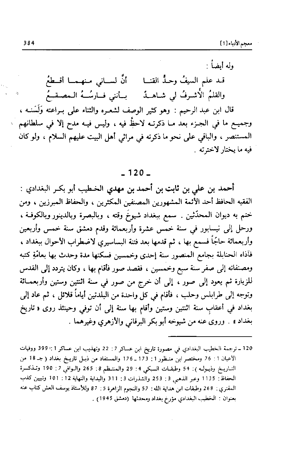 [120]- ترجمة الخطيب البغدادي في مصورة تاريخ ابن عساكر 7: 22 وتهذيب ابن عساكر 1: 399 ووفيات الأعيان 1: 76 ومختصر ابن منظور 1: 173- 176 والمستفاد من ذيل تاريخ بغداد (ج 18 من التاريخ وذيوله) : 54 وطبقات السبكي 4: 29 والمنتظم 8: 265 والوافي 7: 190 وتذكرة الحفاظ: 1135 وعبر الذهبي 3: 253 والشذرات 3: 311 والبداية والنهاية 12: 101 وتبيين كذب المفتري: 268 وطبقات ابن هداية الله: 57 والنجوم الزاهرة 5: 87 وللأستاذ يوسف العش كتاب عنه بعنوان: الخطيب البغدادي مؤرخ بغداد ومحدثها (دمشق 1945) .