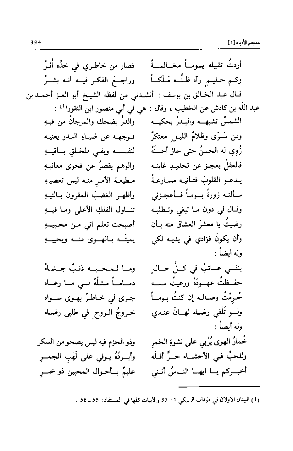 قال عبد الخالق بن يوسف: أنشدني من لفظه الشيخ أبو العز أحمد بن عبد الله بن كادش عن الخطيب، وقال: هي في أبي منصور ابن النقور [1] :