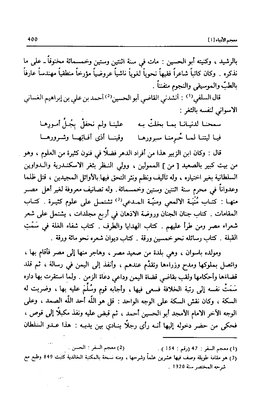 قال السلفي [1] : أنشدني القاضي أبو الحسين [2] أحمد بن علي بن إبراهيم الغساني الاسواني لنفسه بالثغر: