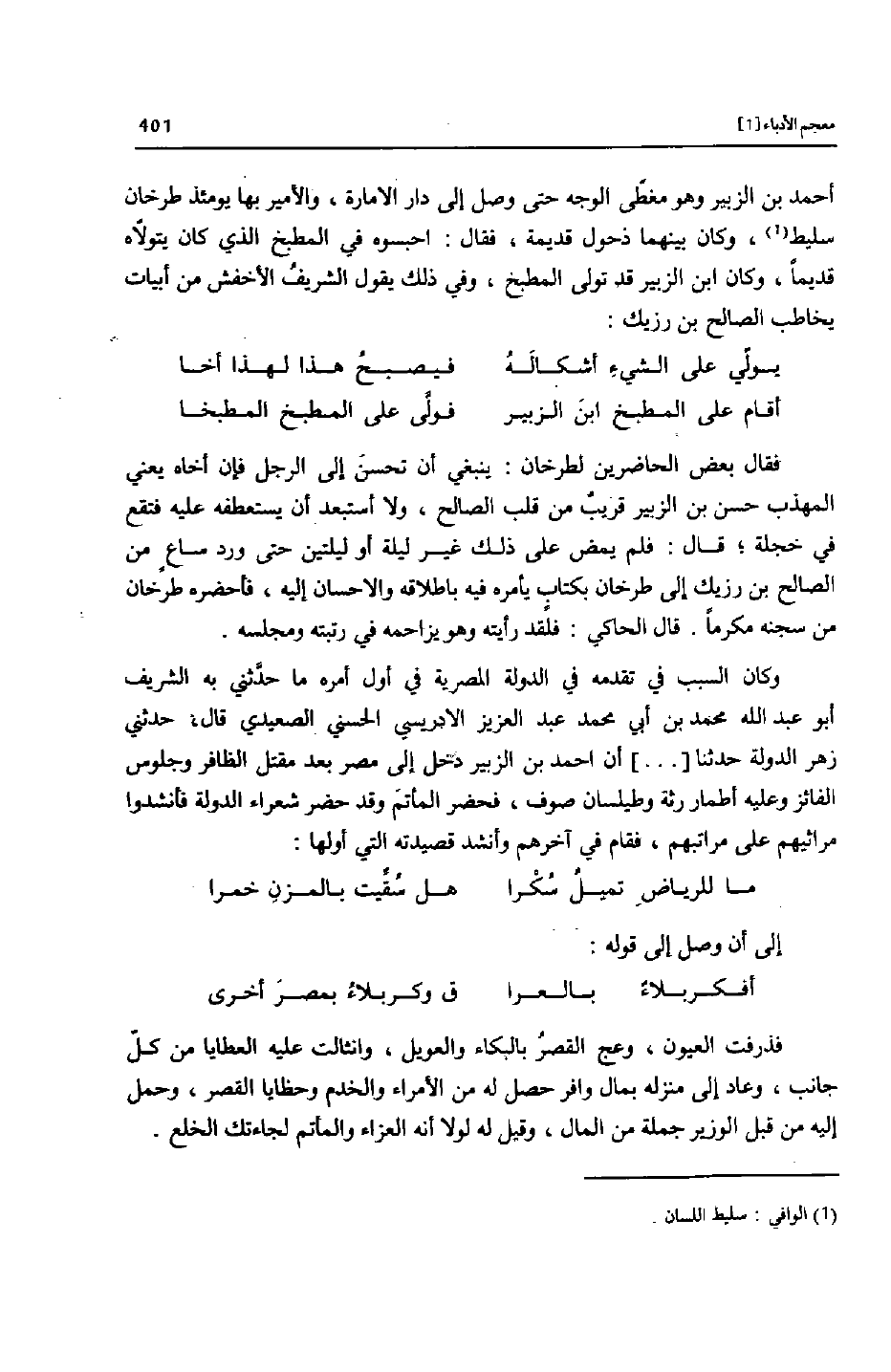 أحمد بن الزبير وهو مغطّى الوجه حتى وصل إلى دار الامارة، والأمير بها يومئذ طرخان سليط [1] ، وكان بينهما ذحول قديمة، فقال: احبسوه في المطبخ الذي كان يتولّاه قديما، وكان ابن الزبير قد تولى المطبخ، وفي ذلك يقول الشريف الأخفش من أبيات يخاطب الصالح بن رزيك: