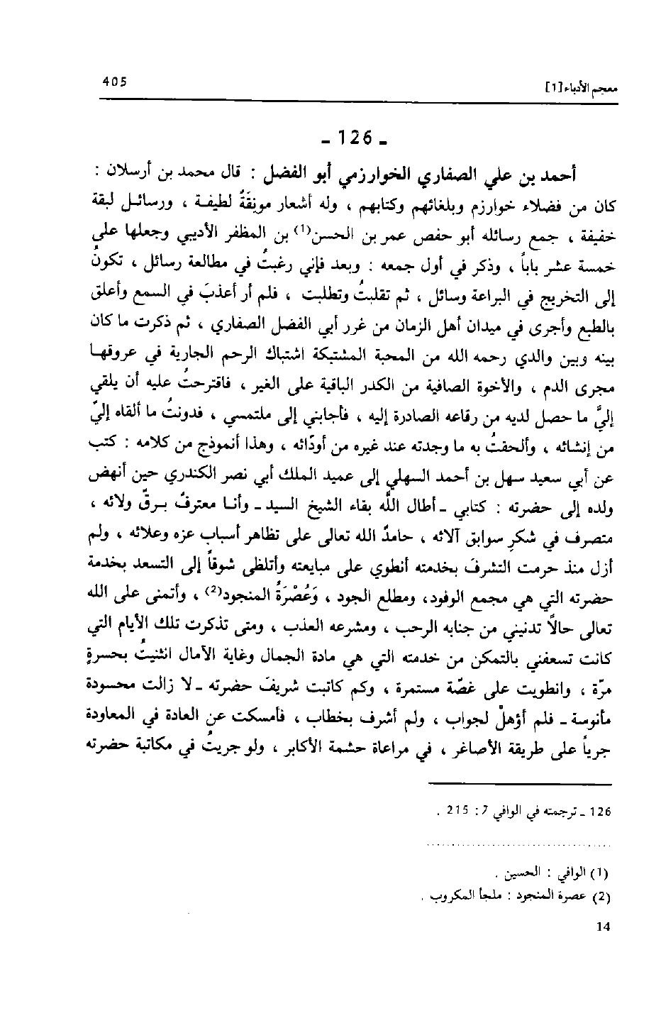كان من فضلاء خوارزم وبلغائهم وكتابهم، وله أشعار مونقة لطيفة، ورسائل لبقة خفيفة، جمع رسائله أبو حفص عمر بن الحسن [1] بن المظفر الأديبي وجعلها على خمسة عشر بابا، وذكر في أول جمعه: وبعد فإني رغبت في مطالعة رسائل، تكون إلى التخريج في البراعة وسائل، ثم تقلبت وتطلبت، فلم أر أعذب في السمع وأعلق بالطبع وأجرى في ميدان أهل الزمان من غرر أبي الفضل الصفاري، ثم ذكرت ما كان بينه وبين والدي رحمه الله من المحبة المشتبكة اشتباك الرحم الجارية في عروقها مجرى الدم، والأخوة الصافية من الكدر الباقية على الغير، فاقترحت عليه أن يلقي إليّ ما حصل لديه من رقاعه الصادرة إليه، فأجابني إلى ملتمسي، فدونت ما ألقاه إليّ من إنشائه، وألحقت به ما وجدته عند غيره من أودّائه، وهذا أنموذج من كلامه: كتب عن أبي سعيد سهل بن أحمد السهلي إلى عميد الملك أبي نصر الكندري حين أنهض ولده إلى حضرته: كتابي- أطال الله بقاء الشيخ السيد- وأنا معترف برقّ ولائه، متصرف في شكر سوابق آلائه، حامد الله تعالى على تظاهر أسباب عزه وعلائه، ولم أزل منذ حرمت التشرف بخدمته أنطوي على مبايعته وأتلظى شوقا إلى التسعد بخدمة حضرته التي هي مجمع الوفود، ومطلع الجود، وعصرة المنجود [2] ، وأتمنى على الله تعالى حالا تدنيني من جنابه الرحب، ومشرعه العذب، ومتى تذكرت تلك الأيام التي كانت تسعفني بالتمكن من خدمته التي هي مادة الجمال وغاية الآمال انثنيت بحسرة مرّة، وانطويت على غصّة مستمرة، وكم كاتبت شريف حضرته- لا زالت محسودة مأنوسة- فلم أؤهل لجواب، ولم أشرف بخطاب، فأمسكت عن العادة في المعاودة جريا على طريقة الأصاغر، في مراعاة حشمة الأكابر، ولو جريت في مكاتبة حضرته