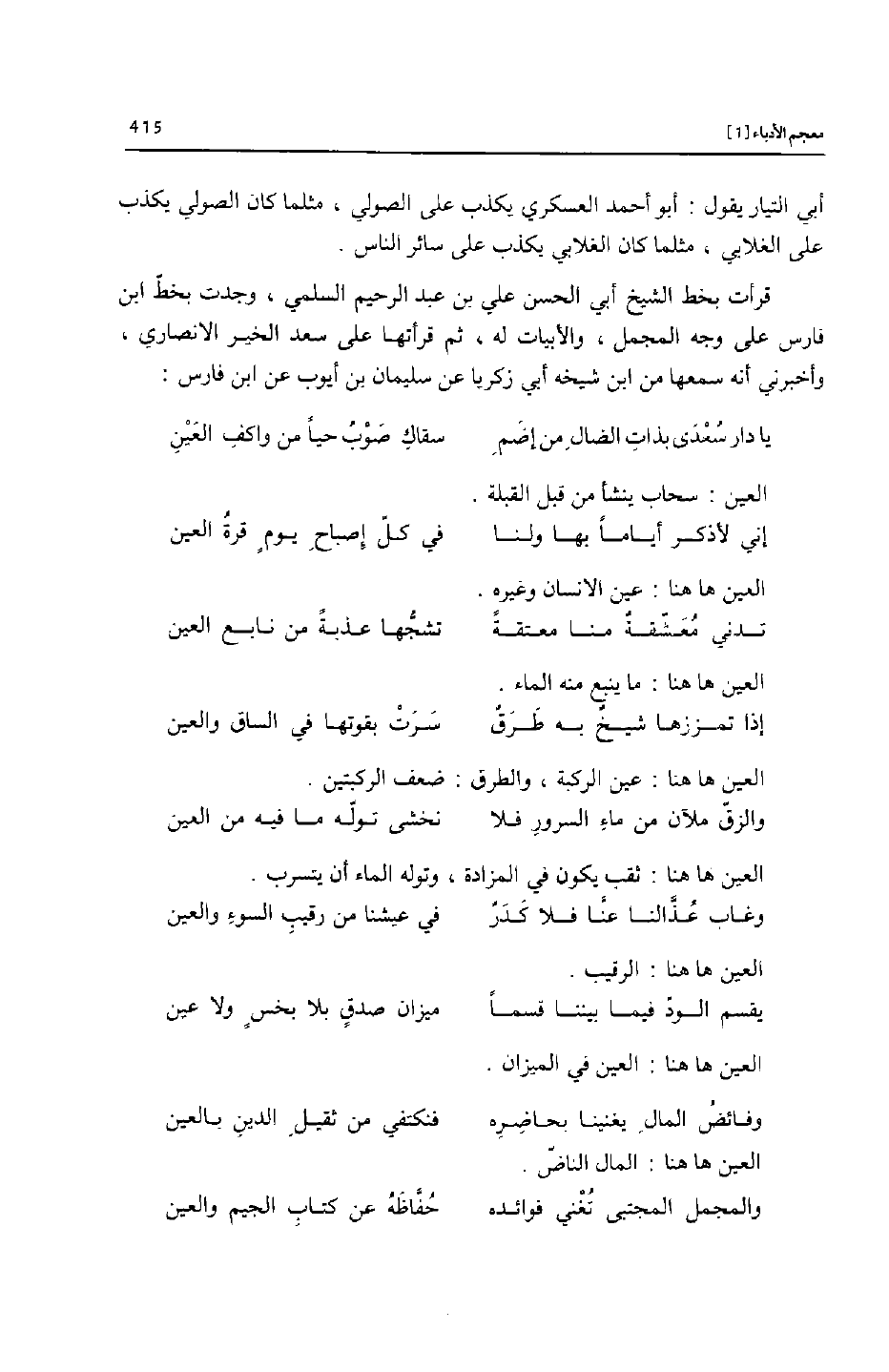 قرأت بخط الشيخ أبي الحسن علي بن عبد الرحيم السلمي، وجدت بخطّ ابن فارس على وجه المجمل، والأبيات له، ثم قرأتها على سعد الخير الانصاري، وأخبرني أنه سمعها من ابن شيخه أبي زكريا عن سليمان بن أيوب عن ابن فارس: