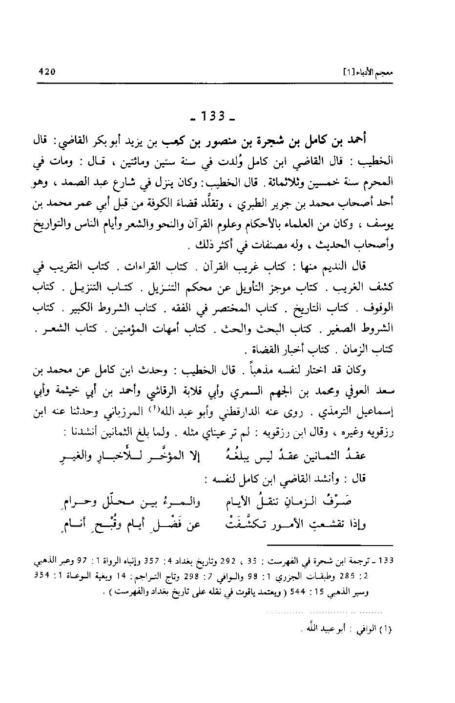 [133]- ترجمة ابن شجرة في الفهرست: 35، 292 وتاريخ بغداد 4: 357 وإنباه الرواة 1: 97 وعبر الذهبي 2: 285 وطبقات الجزري 1: 98 والوافي 7: 298 وتاج التراجم: 14 وبغية الوعاة 1: 354 وسير الذهبي 15: 544 (ويعتمد ياقوت في نقله على تاريخ بغداد والفهرست) .