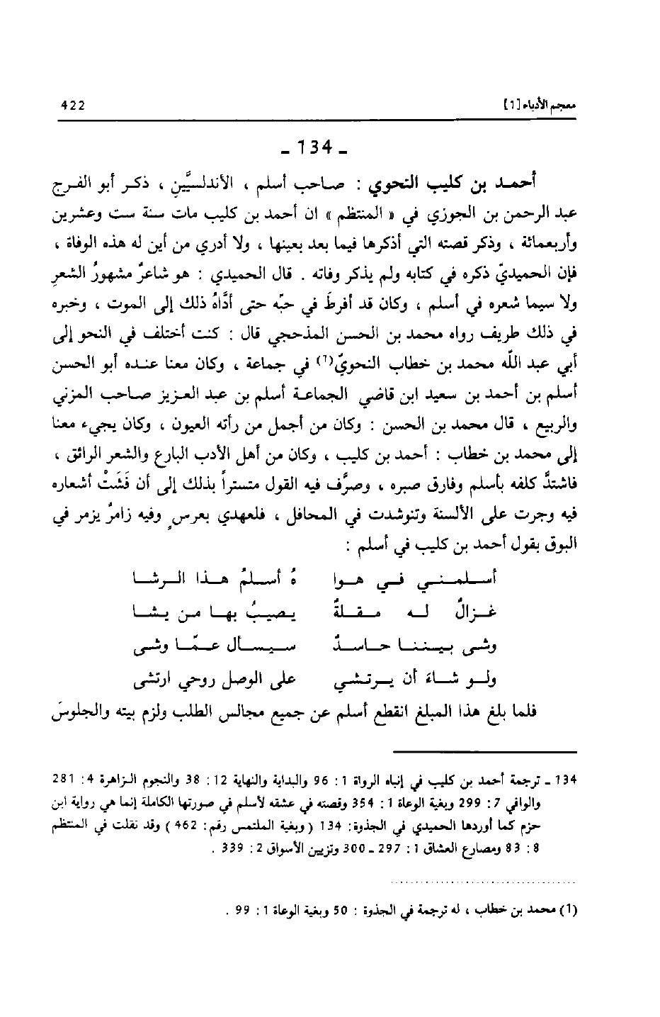[134]- ترجمة أحمد بن كليب في إنباه الرواة 1: 96 والبداية والنهاية 12: 38 والنجوم الزاهرة 4: 281 والوافي 7: 299 وبغية الوعاة 1: 354 وقصته في عشقه لأسلم في صورتها الكاملة إنما هي رواية ابن حزم كما أوردها الحميدي في الجذوة: 134 (وبغية الملتمس رقم: 462) وقد نقلت في المنتظم 8: 83 ومصارع العشاق 1: 297- 300 وتزيين الأسواق 2: 339.