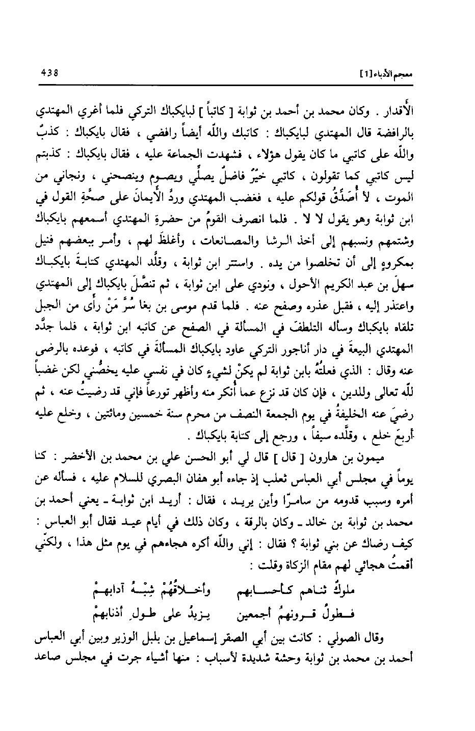 الأقدار. وكان محمد بن أحمد بن ثوابة [كاتبا] لبايكباك التركي فلما أغري المهتدي بالرافضة قال المهتدي لبايكباك: كاتبك والله أيضا رافضي، فقال بايكباك: كذب والله على كاتبي ما كان يقول هؤلاء، فشهدت الجماعة عليه، فقال بايكباك: كذبتم ليس كاتبي كما تقولون، كاتبي خيّر فاضل يصلّي ويصوم وينصحني، ونجاني من الموت، لأ أصدّق قولكم عليه، فغضب المهتدي وردّ الأيمان على صحّة القول في ابن ثوابة وهو يقول لا لا. فلما انصرف القوم من حضرة المهتدي أسمعهم بايكباك وشتمهم ونسبهم إلى أخذ الرشا والمصانعات، وأغلظ لهم، وأمر ببعضهم فنيل بمكروه إلى أن تخلصوا من يده. واستتر ابن ثوابة، وقلّد المهتدي كتابة بايكباك سهل بن عبد الكريم الأحول، ونودي على ابن ثوابة، ثم تنصّل بايكباك إلى المهتدي واعتذر إليه، فقبل عذره وصفح عنه. فلما قدم موسى بن بغا سرّ من رأى من الجبل تلقاه بايكباك وسأله التلطف في المسألة في الصفح عن كاتبه ابن ثوابة، فلما جدّد المهتدي البيعة في دار أناجور التركي عاود بايكباك المسألة في كاتبه، فوعده بالرضى عنه وقال: الذي فعلته بابن ثوابة لم يكن لشيء كان في نفسي عليه يخصّني لكن غضبا لله تعالى وللدين، فإن كان قد نزع عما أنكر منه وأظهر تورعا فإني قد رضيت عنه، ثم رضي عنه الخليفة في يوم الجمعة النصف من محرم سنة خمسين ومائتين، وخلع عليه أربع خلع، وقلّده سيفا، ورجع إلى كتابة بايكباك.