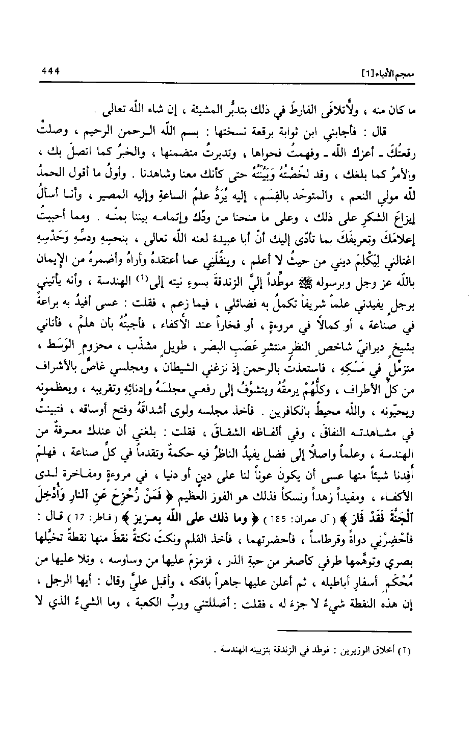 قال: فأجابني ابن ثوابة برقعة نسختها: بسم الله الرّحمن الرّحيم، وصلت رقعتك- أعزك الله- وفهمت فحواها، وتدبرت متضمنها، والخبر كما اتصل بك، والأمر كما بلغك، وقد لخّصته وبيّنته حتى كأنك معنا وشاهدنا. وأول ما أقول الحمد لله مولي النعم، والمتوحّد بالقسم، إليه يردّ علم الساعة وإليه المصير، وأنا أسأل إيزاع الشكر على ذلك، وعلى ما منحنا من ودّك وإتمامه بيننا بمنّه. ومما أحببت إعلامك وتعريفك بما تأدّى إليك أنّ أبا عبيدة لعنه الله تعالى، بنحسه ودسّه وحدسه اغتالني ليكلم ديني من حيث لا أعلم، وينقلني عما أعتقده وأراه وأضمره من الإيمان بالله عز وجل وبرسوله صلى الله عليه وسلم موطّدا إليّ الزندقة بسوء نيته إلى [1] الهندسة، وأنه يأتيني برجل يفيدني علما شريفا تكمل به فضائلي، فيما زعم، فقلت: عسى أفيد به براعة في صناعة، أو كمالا في مروءة، أو فخارا عند الأكفاء، فأجبته بأن هلمّ، فأتاني بشيخ ديرانيّ شاخص النظر منتشر عصب البصر، طويل مشذّب، محزوم الوسط، متزمّل في مسكه، فاستعذت بالرحمن إذ نزغني الشيطان، ومجلسي غاصّ بالأشراف من كلّ الأطراف، وكلّهم يرمقه ويتشوّف إلى رفعي مجلسه وإدنائه وتقريبه، ويعظمونه ويحيّونه، والله محيط بالكافرين. فأخذ مجلسه ولوى أشداقه وفتح أوساقه، فتبينت في مشاهدته النفاق، وفي ألفاظه الشقاق، فقلت: بلغني أن عندك معرفة من الهندسة، وعلما واصلا إلى فضل يفيد الناظر فيه حكمة وتقدما في كلّ صناعة، فهلمّ أفدنا شيئا منها عسى أن يكون عونا لنا على دين أو دنيا، في مروءة ومفاخرة لدى الأكفاء، ومفيدا زهدا ونسكا فذلك هو الفوز العظيم فَمَنْ زُحْزِحَ عَنِ النَّارِ وَأُدْخِلَ الْجَنَّةَ فَقَدْ فازَ