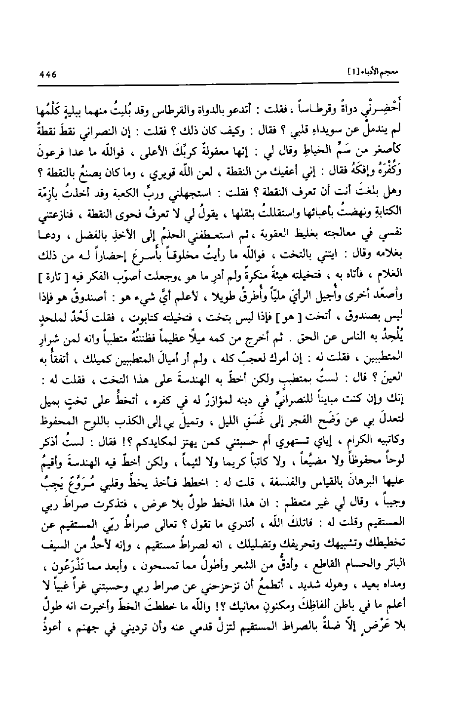 إنك وإن كنت مباينا للنصرانيّ في دينه لمؤازر له في كفره، أتخطّ على تخت بميل لتعدل بي عن وضح الفجر إلى غسق الليل، وتميل بي إلى الكذب باللوح المحفوظ وكاتبيه الكرام، إياي تستهوي أم حسبتني كمن يهتز لمكايدكم؟! فقال: لست أذكر لوحا محفوظا ولا مضيّعا، ولا كاتبا كريما ولا لئيما، ولكن أخطّ فيه الهندسة وأقيم عليها البرهان بالقياس والفلسفة، قلت له: اخطط فأخذ يخطّ وقلبي مروّع يجب وجيبا، وقال لي غير متعظم: ان هذا الخط طول بلا عرض، فتذكرت صراط ربي المستقيم وقلت له: قاتلك الله، أتدري ما تقول؟ تعالى صراط ربّي المستقيم عن تخطيطك وتشبيهك وتحريفك وتضليلك، انه لصراط مستقيم، وإنه لأحدّ من السيف الباتر والحسام القاطع، وأدقّ من الشعر وأطول مما تمسحون، وأبعد مما تذرعون، ومداه بعيد، وهو له شديد، أتطمع أن تزحزحني عن صراط ربي وحسبتني غرا غبيا لا أعلم ما في باطن ألفاظك ومكنون معانيك؟! والله ما خططت الخطّ وأخبرت انه طول بلا عرض إلّا ضلة بالصراط المستقيم لتزلّ قدمي عنه وأن ترديني في جهنم، أعوذ