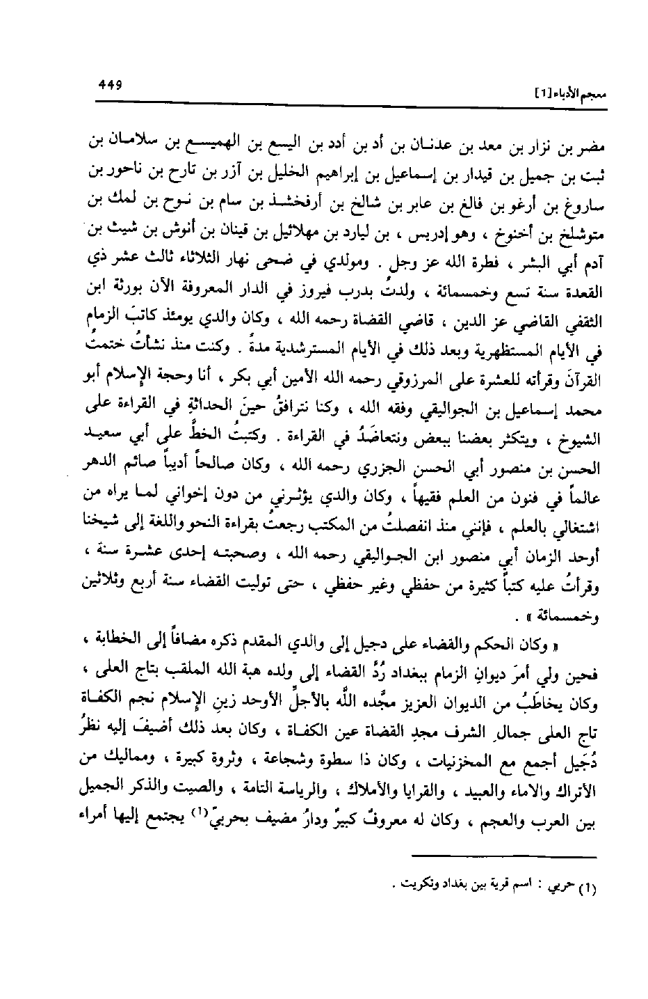مضر بن نزار بن معد بن عدنان بن أد بن أدد بن اليسع بن الهميسع بن سلامان بن ثبت بن جميل بن قيدار بن إسماعيل بن إبراهيم الخليل بن آزر بن تارح بن ناحور بن ساروغ بن أرغو بن فالغ بن عابر بن شالخ بن أرفخشذ بن سام بن نوح بن لمك بن متوشلخ بن أخنوخ، وهو إدريس، بن ليارد بن مهلائيل بن قينان بن أنوش بن شيث بن آدم أبي البشر، فطرة الله عز وجل. ومولدي في ضحى نهار الثلاثاء ثالث عشر ذي القعدة سنة تسع وخمسمائة، ولدت بدرب فيروز في الدار المعروفة الآن بورثة ابن الثقفي القاضي عز الدين، قاضي القضاة رحمه الله، وكان والدي يومئذ كاتب الزمام في الأيام المستظهرية وبعد ذلك في الأيام المسترشدية مدة. وكنت منذ نشأت ختمت القرآن وقرأته للعشرة على المرزوقي رحمه الله الأمين أبي بكر، أنا وحجة الإسلام أبو محمد إسماعيل بن الجواليقي وفقه الله، وكنا نترافق حين الحداثة في القراءة على الشيوخ، ويتكثر بعضنا ببعض ونتعاضد في القراءة. وكتبت الخطّ على أبي سعيد الحسن بن منصور أبي الحسن الجزري رحمه الله، وكان صالحا أديبا صائم الدهر عالما في فنون من العلم فقيها، وكان والدي يؤثرني من دون إخواني لما يراه من اشتغالي بالعلم، فإنني منذ انفصلت من المكتب رجعت بقراءة النحو واللغة إلى شيخنا أوحد الزمان أبي منصور ابن الجواليقي رحمه الله، وصحبته إحدى عشرة سنة، وقرأت عليه كتبا كثيرة من حفظي وغير حفظي، حتى توليت القضاء سنة أربع وثلاثين وخمسمائة» .