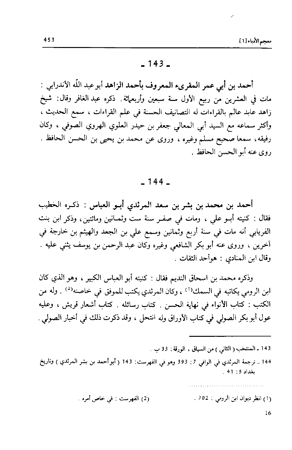 [144]- ترجمة المرثدي في الوافي 7: 393 وهو في الفهرست: 143 (أبو أحمد بن بشر المرثدي) وتاريخ بغداد 5: 41.