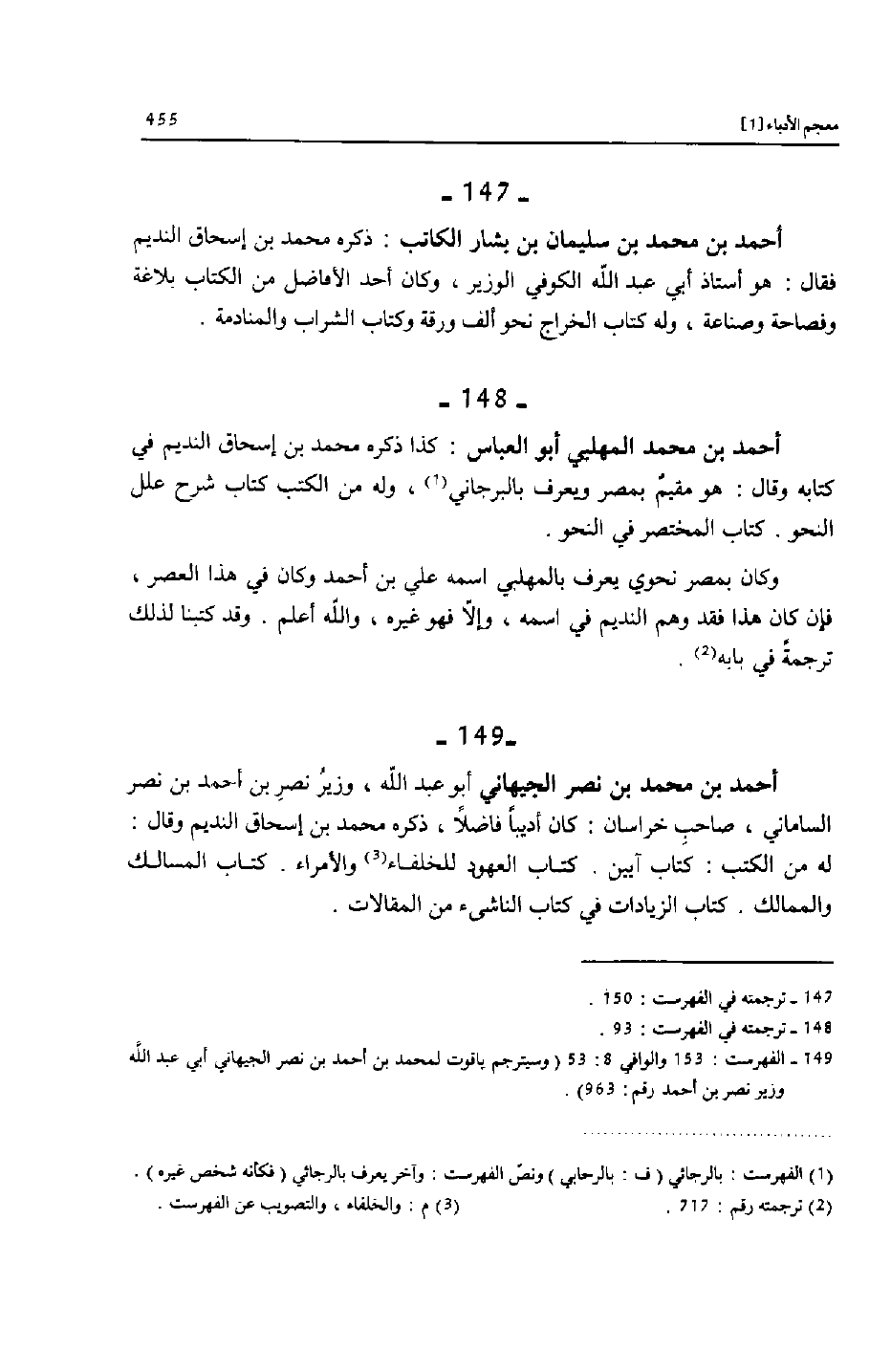 [149]- الفهرست: 153 والوافي 8: 53 (وسيترجم ياقوت لمحمد بن أحمد بن نصر الجيهاني أبي عبد الله وزير نصر بن أحمد رقم: 963) .