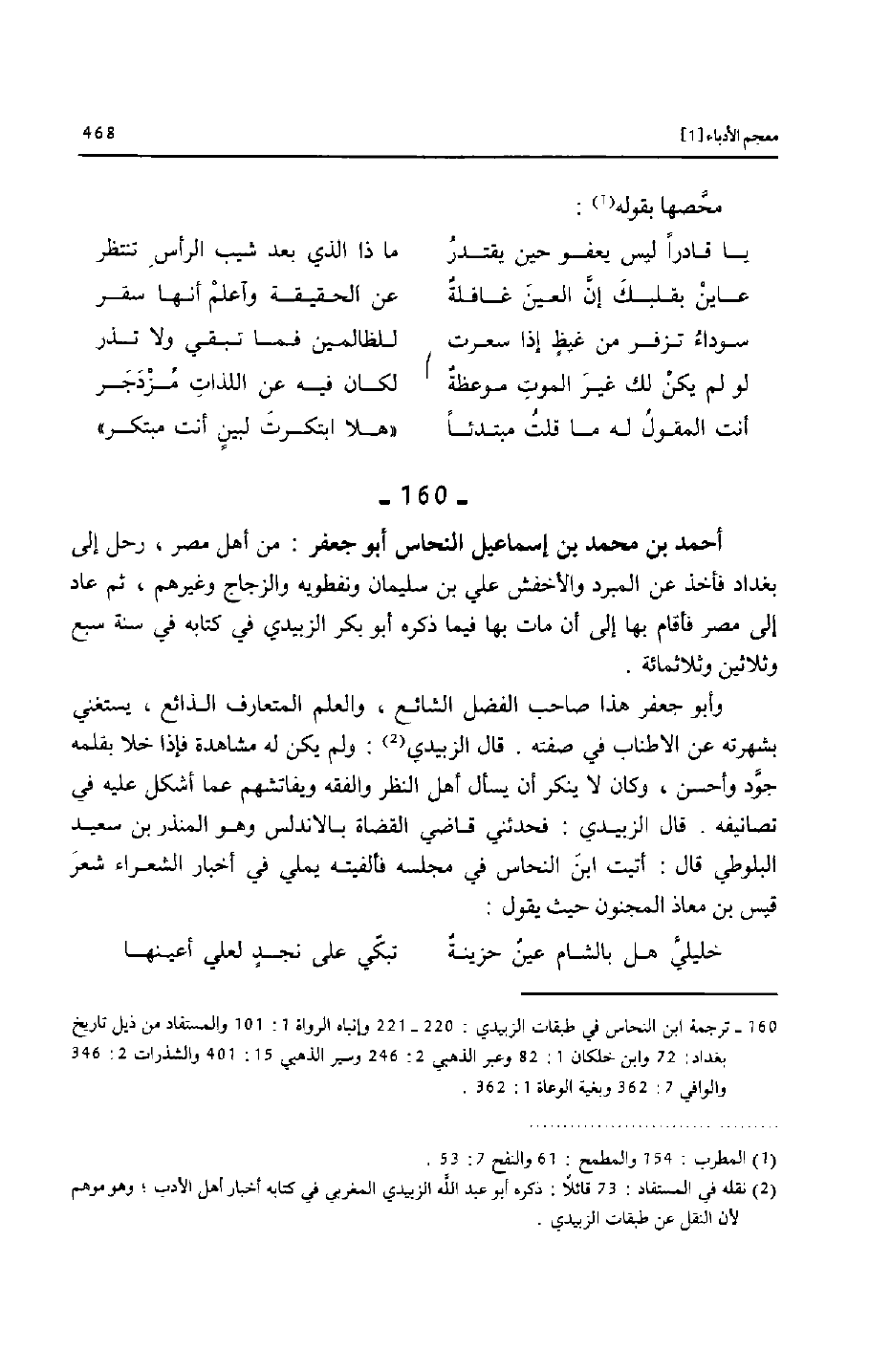 [160]- ترجمة ابن النحاس في طبقات الزبيدي: 220- 221 وإنباه الرواة 1: 101 والمستفاد من ذيل تاريخ بغداد: 72 وابن خلكان 1: 82 وعبر الذهبي 2: 246 وسير الذهبي 15: 401 والشذرات 2: 346 والوافي 7: 362 وبغية الوعاة 1: 362.