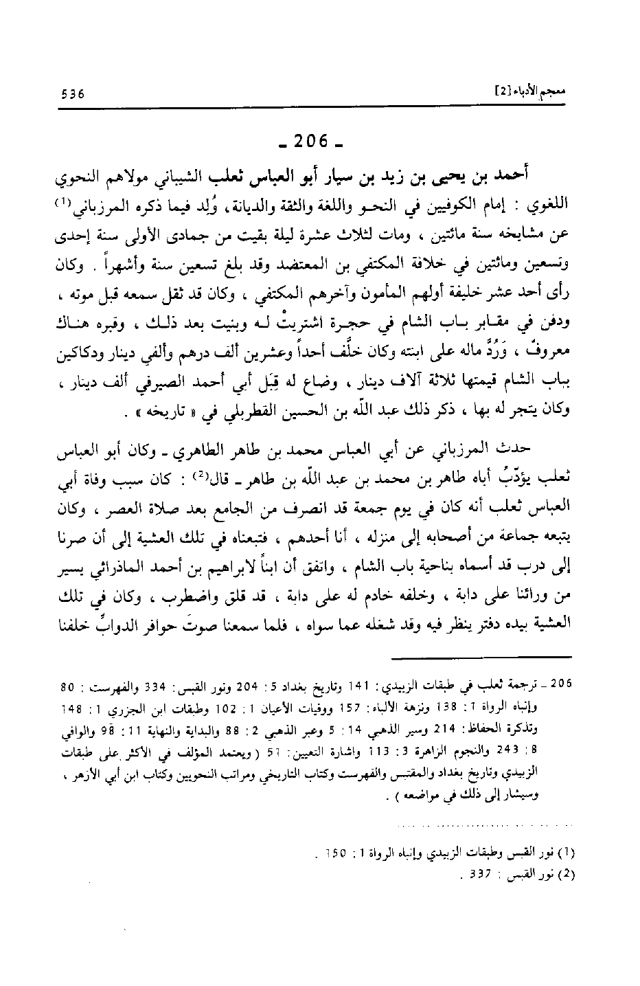 [206]- ترجمة ثعلب في طبقات الزبيدي: 141 وتاريخ بغداد 5: 204 ونور القبس: 334 والفهرست: 80 وإنباه الرواة 1: 138 ونزهة الألباء: 157 ووفيات الأعيان 1: 102 وطبقات ابن الجزري 1: 148 وتذكرة الحفاظ: 214 وسير الذهبي 14: 5 وعبر الذهبي 2: 88 والبداية والنهاية 11: 98 والوافي 8: 243 والنجوم الزاهرة 3: 113 واشارة التعيين: 51 (ويعتمد المؤلف في الأكثر على طبقات الزبيدي وتاريخ بغداد والمقتبس والفهرست وكتاب التاريخي ومراتب النحويين وكتاب ابن أبي الأزهر، وسيشار إلى ذلك في مواضعه) .