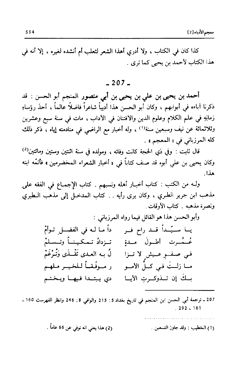 [207]- ترجمة أبي الحسن ابن المنجم في تاريخ بغداد 5: 215 والوافي 8: 246 وانظر الفهرست 160- 161، 292.