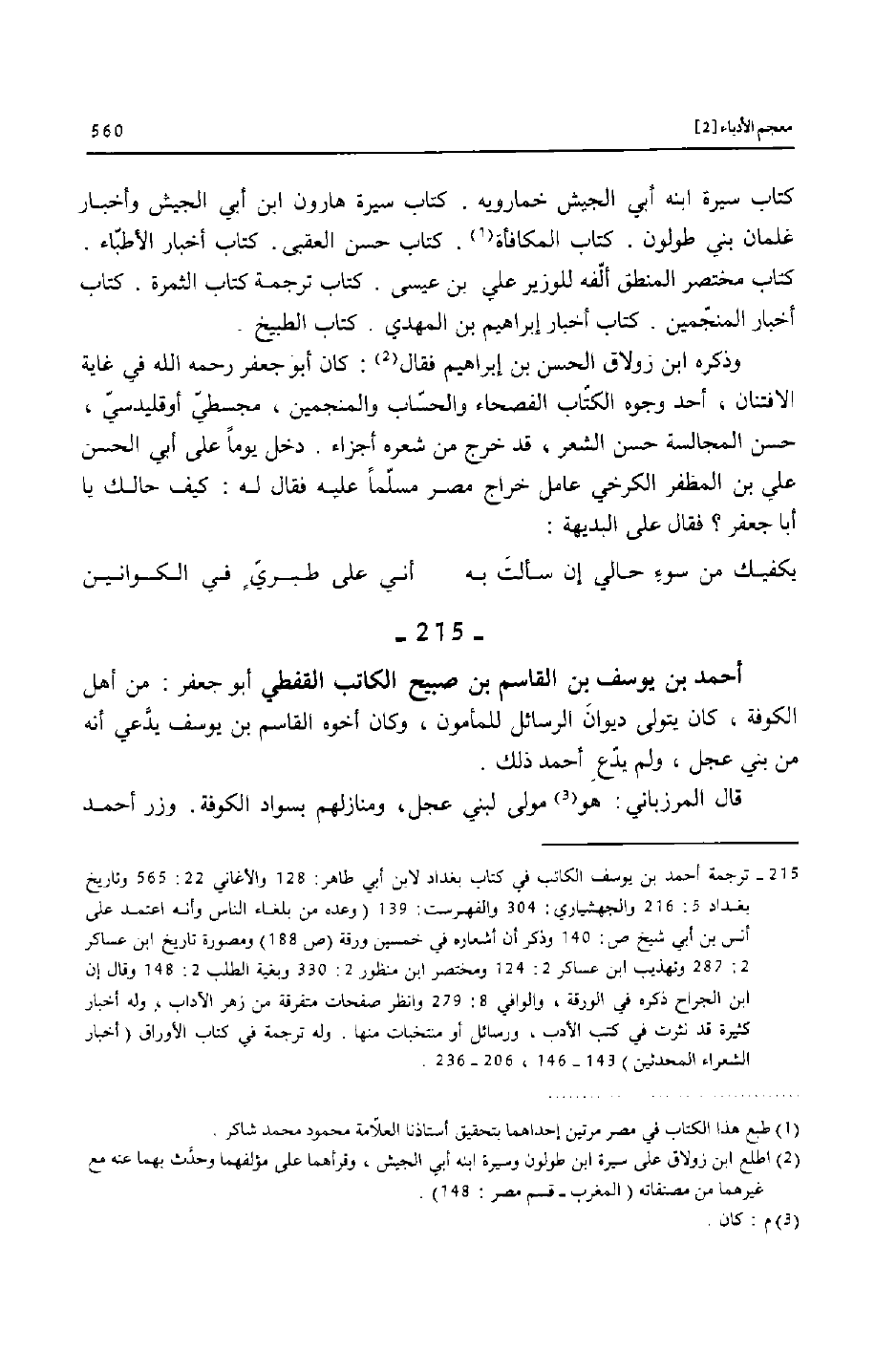 [215]- ترجمة أحمد بن يوسف الكاتب في كتاب بغداد لابن أبي طاهر: 128 والأغاني 22: 565 وتاريخ بغداد 5: 216 والجهشياري: 304 والفهرست: 139 (وعده من بلغاء الناس وأنه اعتمد على أنس بن أبي شيخ ص: 140 وذكر أن أشعاره في خمسين ورقة (ص 188) ومصورة تاريخ ابن عساكر 2: 287 وتهذيب ابن عساكر 2: 124 ومختصر ابن منظور 2: 330 وبغية الطلب 2: 148 وقال إن ابن الجراح ذكره في الورقة، والوافي 8: 279 وانظر صفحات متفرقة من زهر الآداب، وله أخبار كثيرة قد نثرت في كتب الأدب، ورسائل أو منتخبات منها. وله ترجمة في كتاب الأوراق (أخبار الشعراء المحدثين) 143- 146، 206- 236.