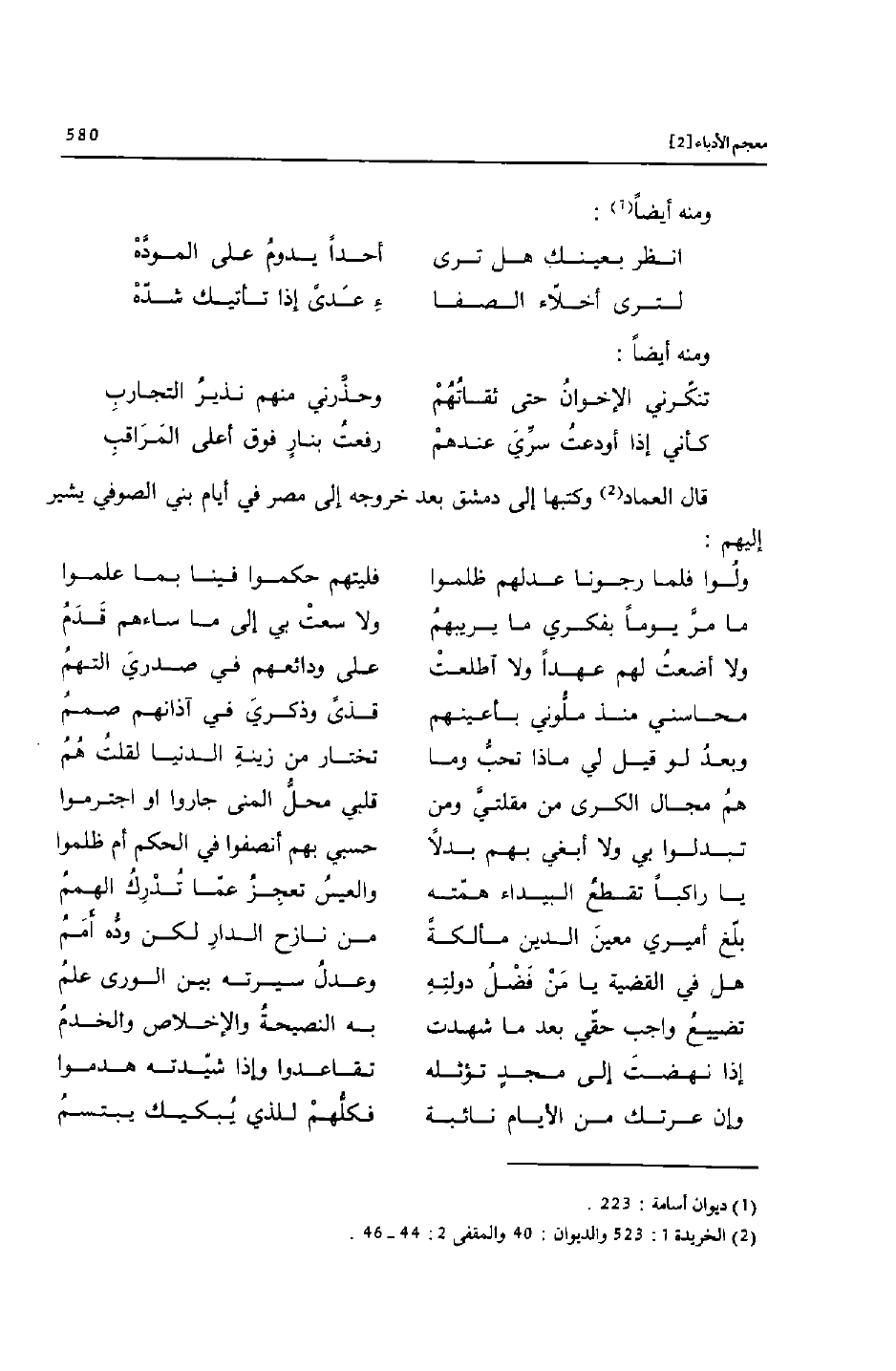 قال العماد «2» وكتبها إلى دمشق بعد خروجه إلى مصر في أيام بني الصوفي يشير إليهم: