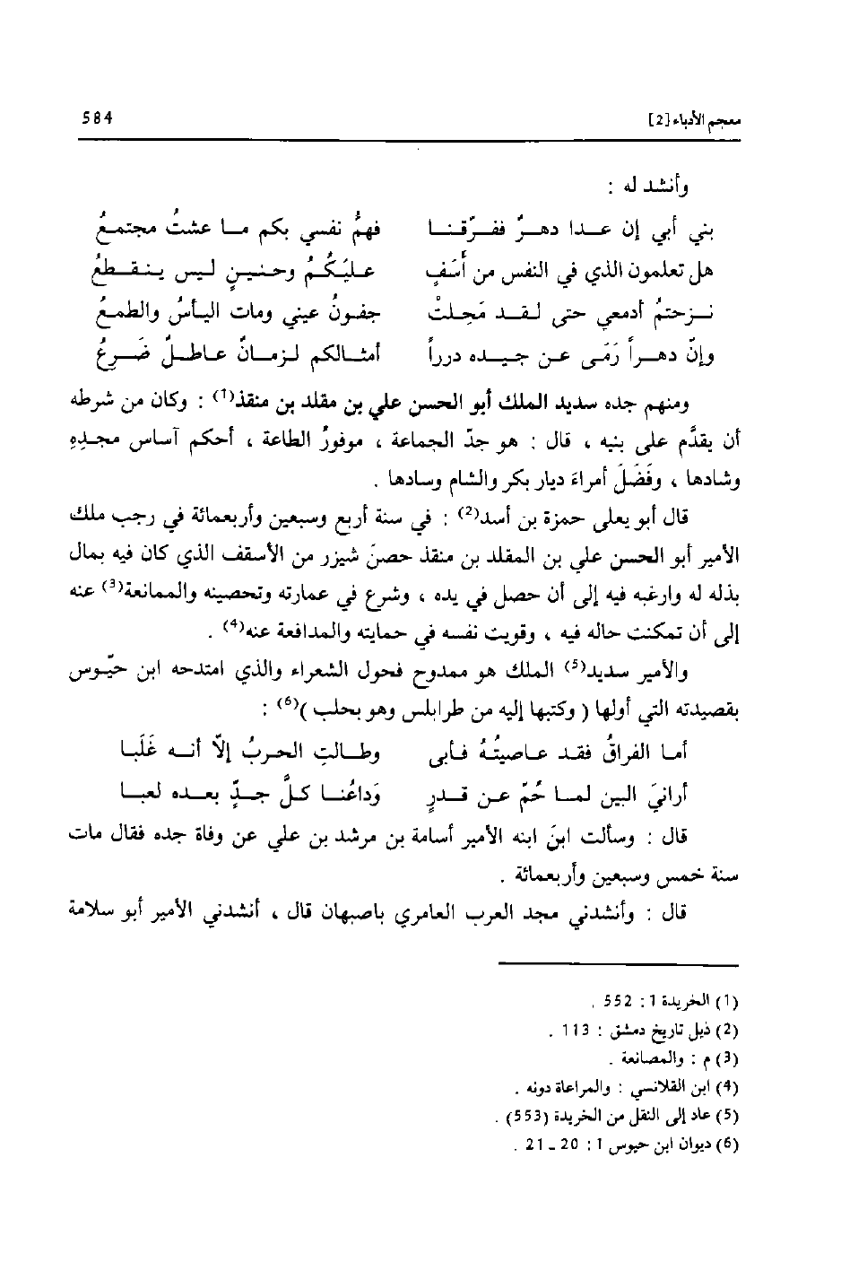والأمير سديد «5» الملك هو ممدوح فحول الشعراء والذي امتدحه ابن حيّوس بقصيدته التي أولها (وكتبها إليه من طرابلس وهو بحلب) «6» :