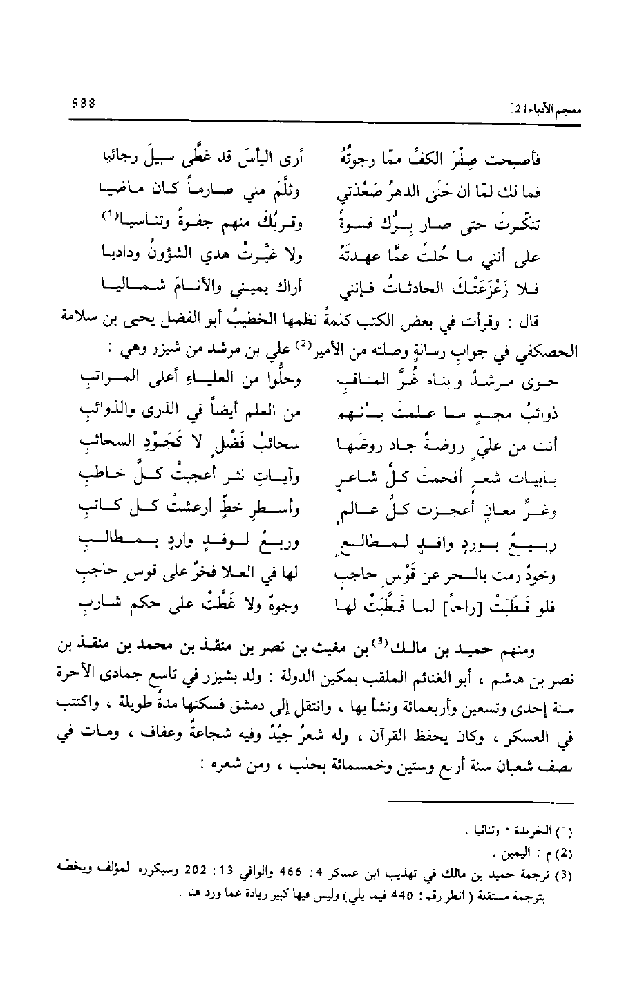 قال: وقرأت في بعض الكتب كلمة نظمها الخطيب أبو الفضل يحيى بن سلامة الحصكفي في جواب رسالة وصلته من الأمير «2» علي بن مرشد من شيزر وهي: