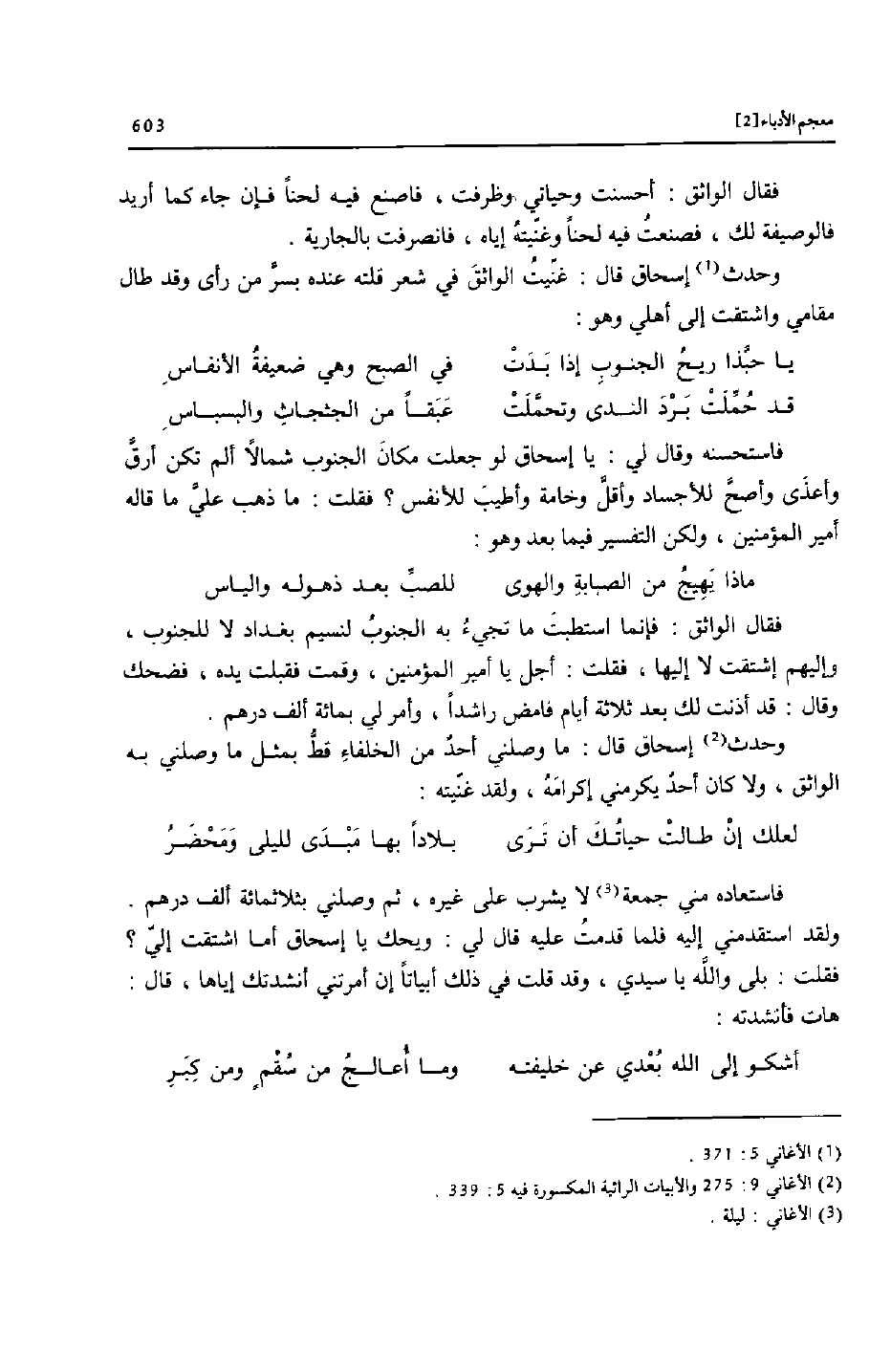 فاستحسنه وقال لي: يا إسحاق لو جعلت مكان الجنوب شمالا ألم تكن أرقّ وأعذى وأصحّ للأجساد وأقلّ وخامة وأطيب للأنفس؟ فقلت: ما ذهب عليّ ما قاله أمير المؤمنين، ولكن التفسير فيما بعد وهو: