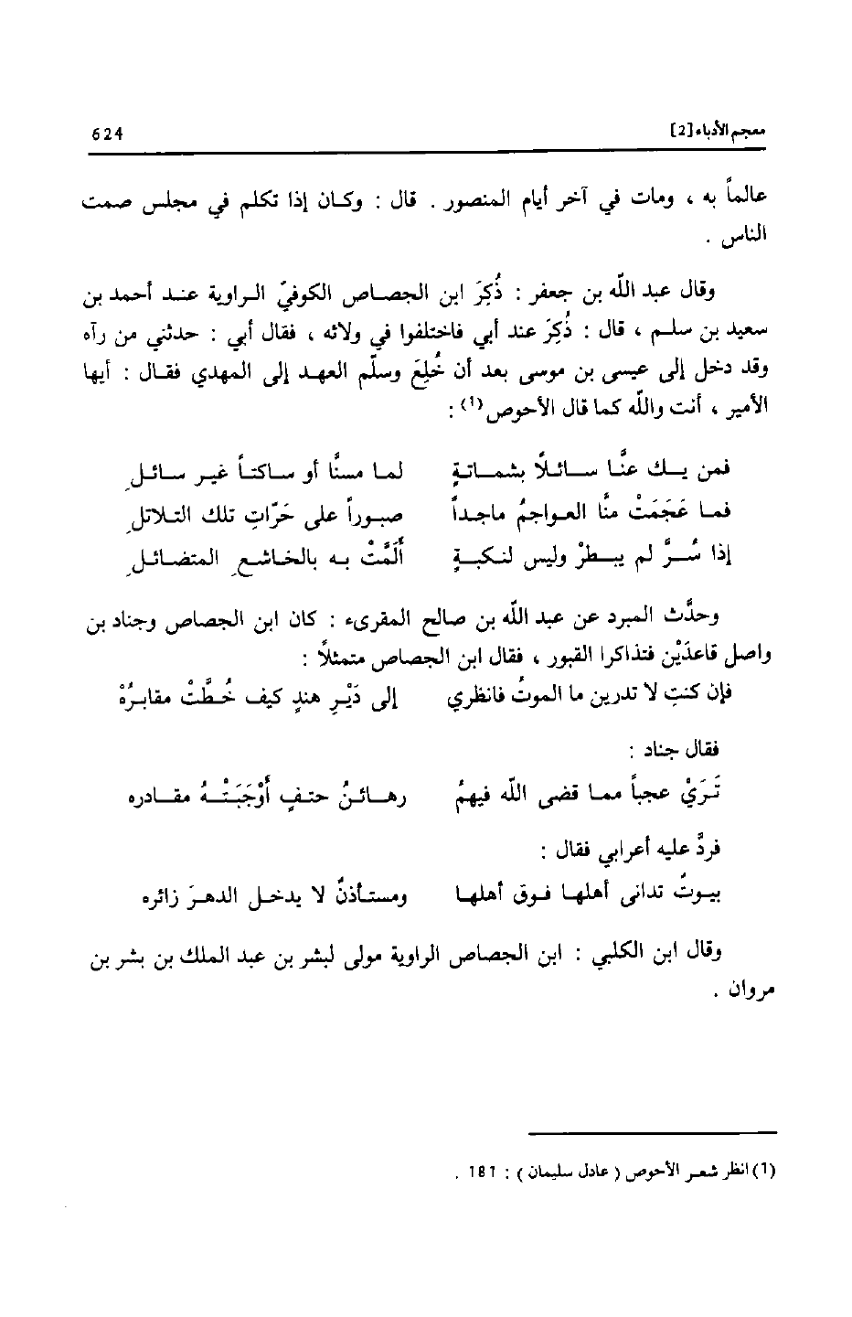 وقال عبد الله بن جعفر: ذكر ابن الجصاص الكوفيّ الراوية عند أحمد بن سعيد بن سلم، قال: ذكر عند أبي فاختلفوا في ولائه، فقال أبي: حدثني من رآه وقد دخل إلى عيسى بن موسى بعد أن خلع وسلّم العهد إلى المهدي فقال: أيها الأمير، أنت والله كما قال الأحوص «1» :