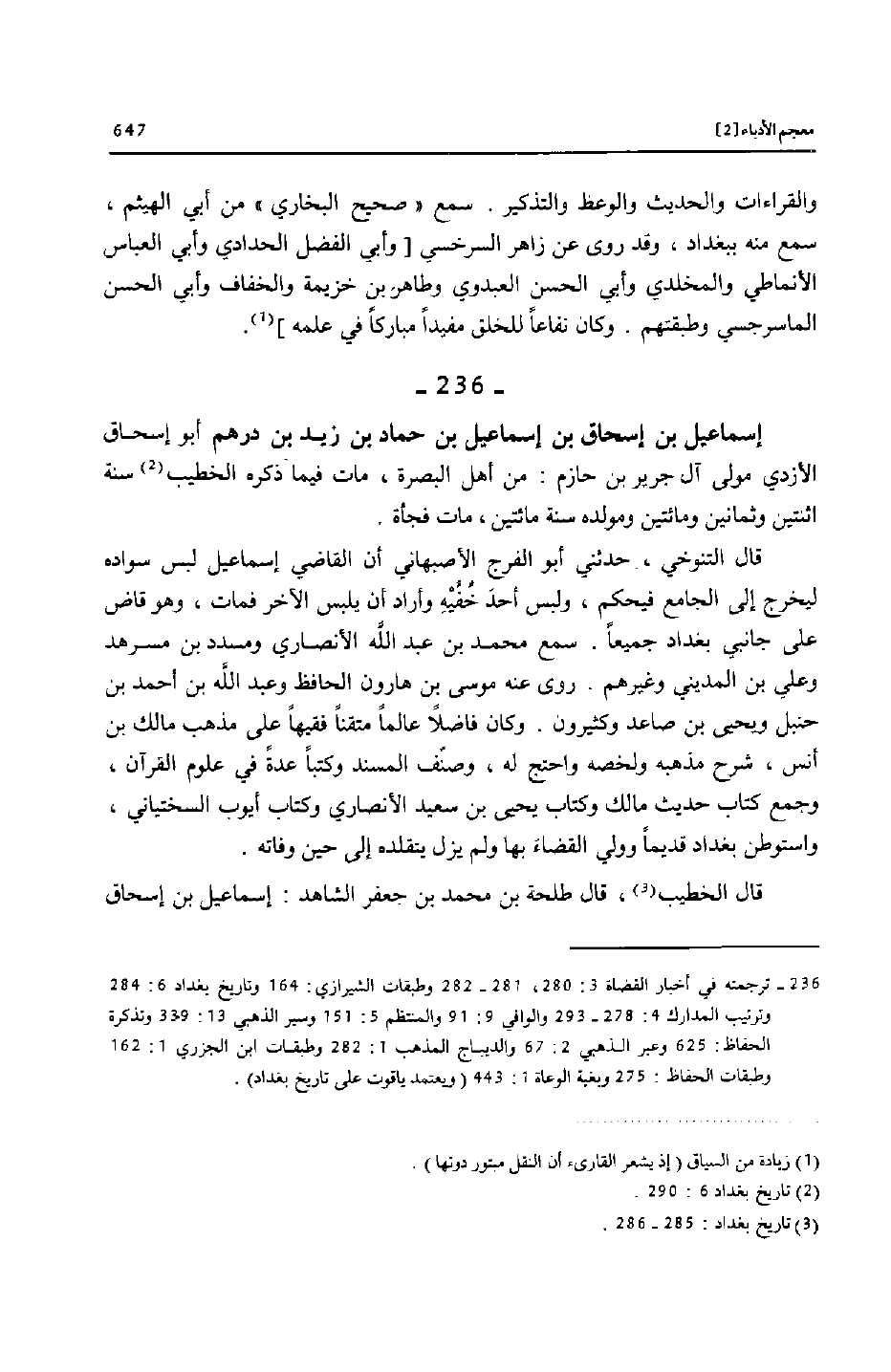 [236]- ترجمته في أخبار القضاة 3: 280، 281- 282 وطبقات الشيرازي: 164 وتاريخ بغداد 6: 284 وترتيب المدارك 4: 278- 293 والوافي 9: 91 والمنتظم 5: 151 وسير الذهبي 13: 339 وتذكرة الحفاظ: 625 وعبر الذهبي 2: 67 والديباج المذهب 1: 282 وطبقات ابن الجزري 1: 162 وطبقات الحفاظ: 275 وبغية الوعاة 1: 443 (ويعتمد ياقوت على تاريخ بغداد) .