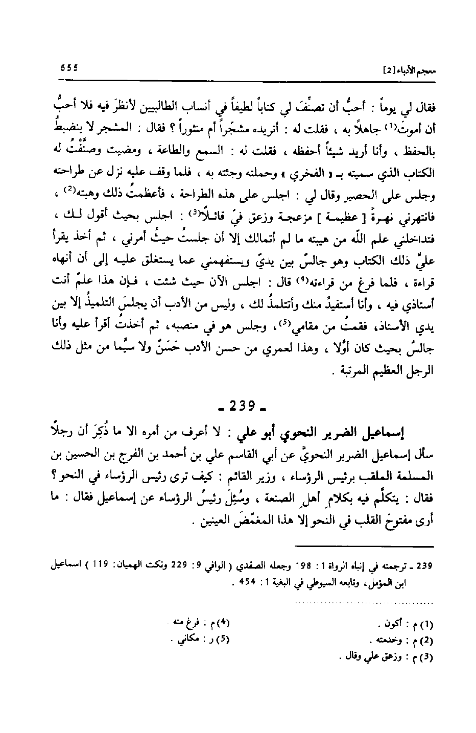 [239]- ترجمته في إنباه الرواة 1: 198 وجعله الصفدي (الوافي 9: 229 ونكت الهميان: 119) اسماعيل ابن المؤمل، وتابعه السيوطي في البغية 1: 454.