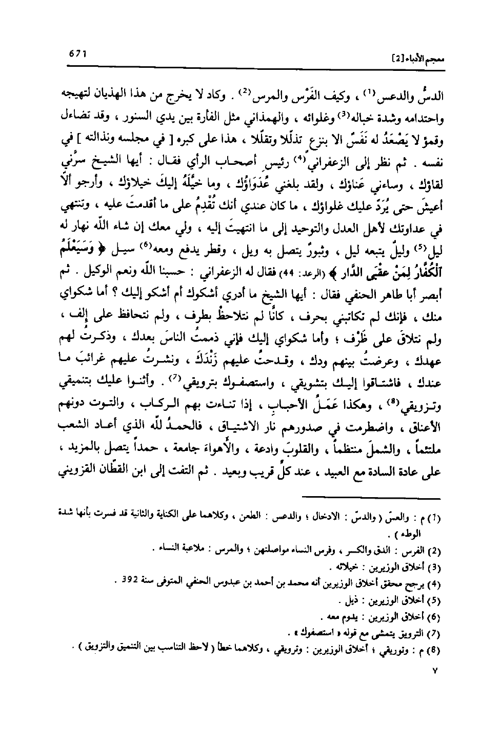 (الرعد: 44) فقال له الزعفراني: حسبنا الله ونعم الوكيل. ثم أبصر أبا طاهر الحنفي فقال: أيها الشيخ ما أدري أشكوك أم أشكو إليك؟ أما شكواي منك، فإنك لم تكاتبني بحرف، كانّا لم نتلاحظ بطرف، ولم نتحافظ على إلف، ولم نتلاق على ظرف؛ وأما شكواي إليك فإني ذممت الناس بعدك، وذكرت لهم عهدك، وعرضت بينهم ودك، وقدحت عليهم زندك، ونشرت عليهم غرائب ما عندك، فاشتاقوا إليك بتشويقي، واستصفوك بترويقي «7» . وأثنوا عليك بتنميقي وتزويقي «8» ، وهكذا عمل الأحباب، إذا تناءت بهم الركاب، والتوت دونهم الأعناق، واضطرمت في صدورهم نار الاشتياق، فالحمد لله الذي أعاد الشعب ملتئما، والشمل منتظما، والقلوب وادعة، والأهواء جامعة، حمدا يتصل بالمزيد، على عادة السادة مع العبيد، عند كلّ قريب وبعيد. ثم التفت إلى ابن القطّان القزويني