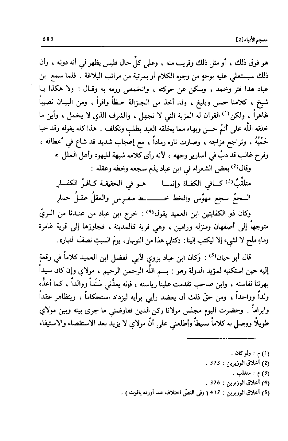 قال أبو حيان «5» : وكان ابن عباد يروي لأبي الفضل ابن العميد كلاما في رقعة إليه حين استكتبه لمؤيد الدولة وهو: بسم الله الرحمن الرحيم، مولاي وإن كان سيدا بهرتنا نفاسته، وابن صاحب تقدمت علينا رياسته، فإنه يعدّني سندا ووالدا، كما أعدّه ولدا وواحدا، ومن حقّ ذلك أن يعضد رأيي برأيه ليزداد استحكاما، ويتظاهر عقدا وابراما. وحضرت اليوم مجلس مولانا ركن الدين ففاوضني ما جرى بينه وبين مولاي طويلا ووصل به كلاما بسيطا وأطلعني على أنّ مولاي لا يزيد بعد الاستقصاء والاستيفاء