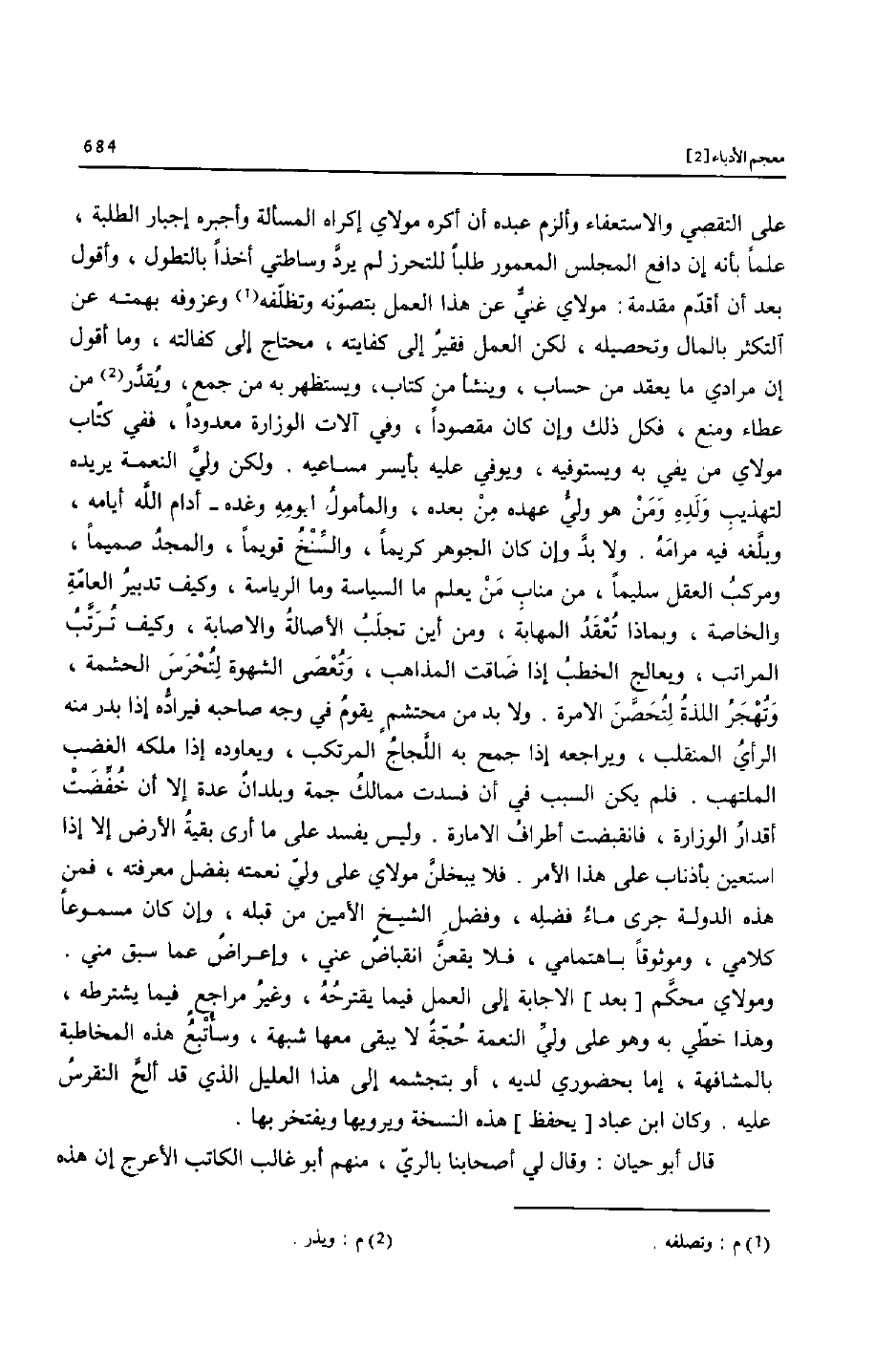 ومولاي محكّم [بعد] الاجابة إلى العمل فيما يقترحه، وغير مراجع فيما يشترطه، وهذا خطّي به وهو على وليّ النعمة حجّة لا يبقى معها شبهة، وسأتبع هذه المخاطبة بالمشافهة، إما بحضوري لديه، أو بتجشمه إلى هذا العليل الذي قد ألحّ النقرس عليه. وكان ابن عباد [يحفظ] هذه النسخة ويرويها ويفتخر بها.
